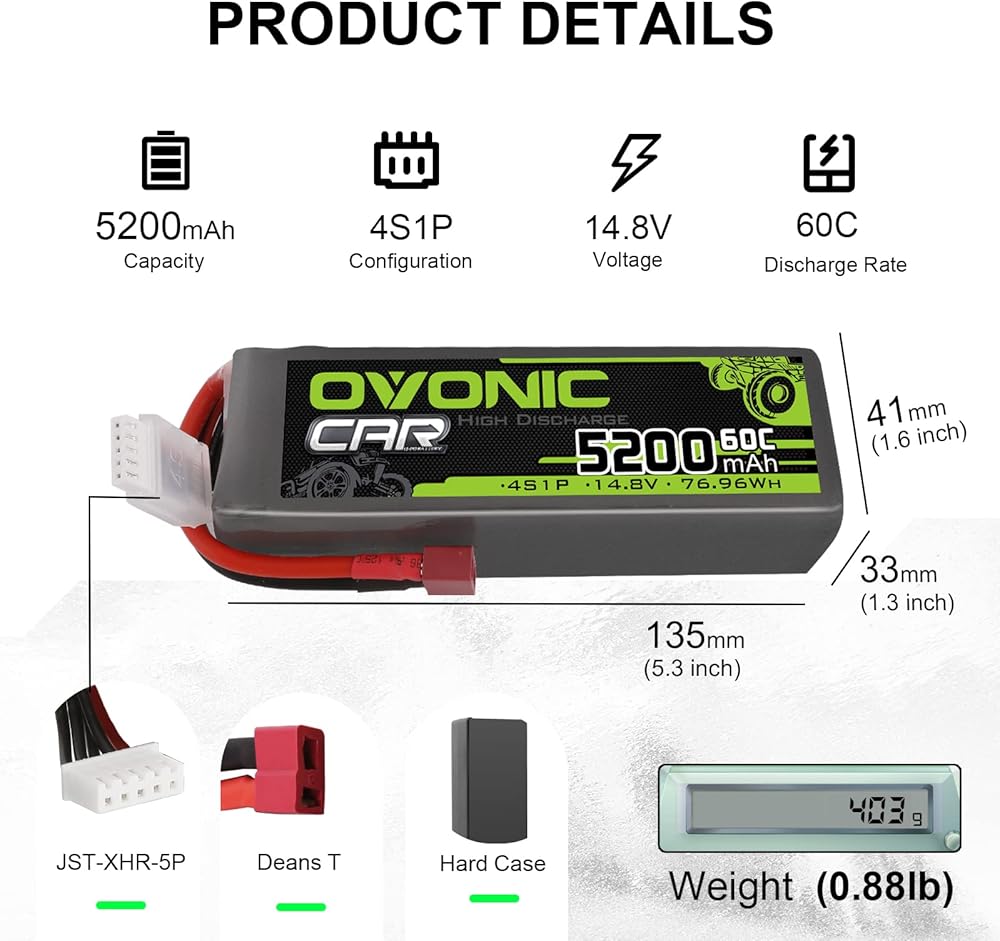 • 🔋 specification - البعد البيضاوي 5200MAH14.8V البعد LIPO (± 3mm): 134 × 42 × 33 مم / 5.28x1.65x1.3inch (L*W*H) ، الوزن التقريبي (± 5g): 405g / 0.89lb