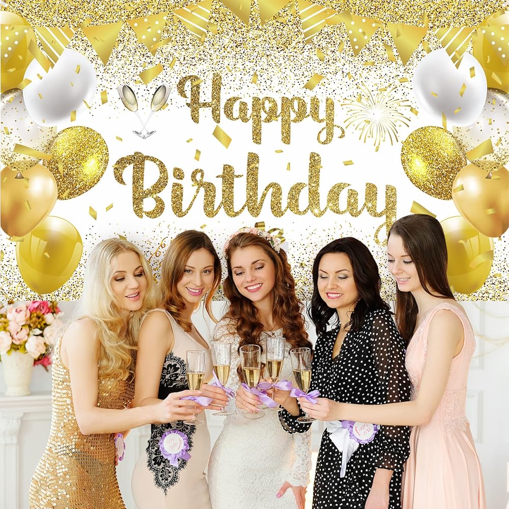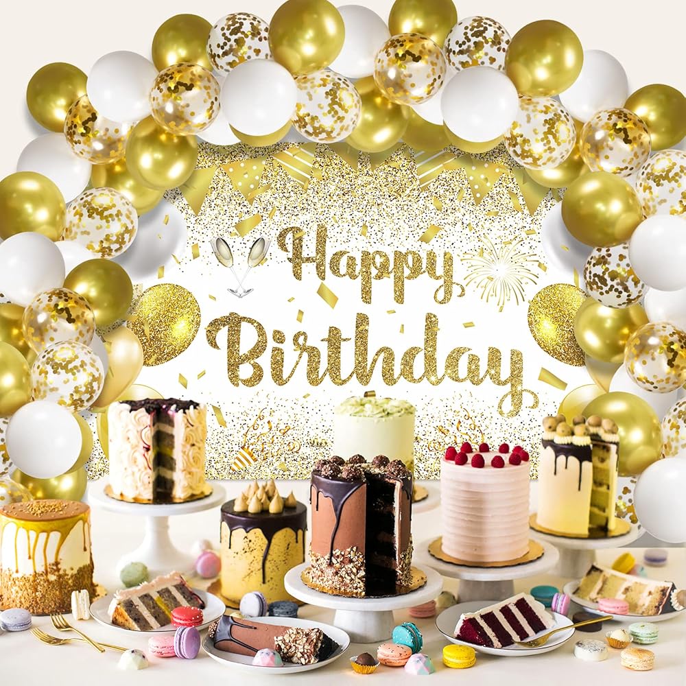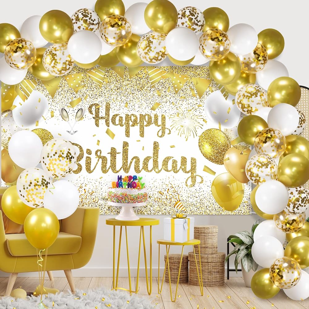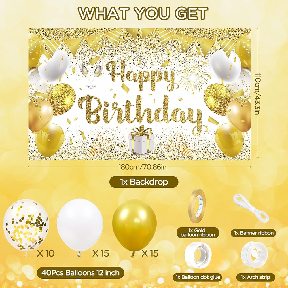 ✨[Quality Materials]- The balloons are made of quality latex, non-toxic, and not easy to break. Besides, gold white happy birthday backdrop for women is made of durable polyester, which is lightweight, foldable, and washable. it can be reused for a long time