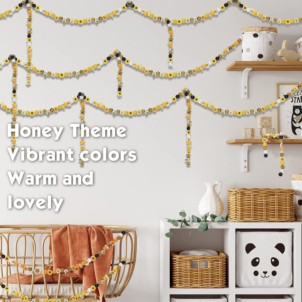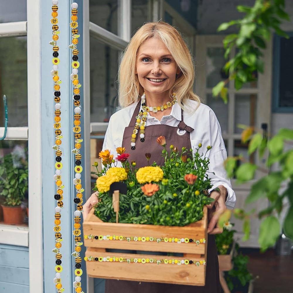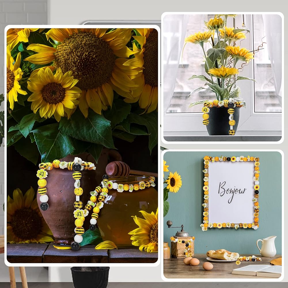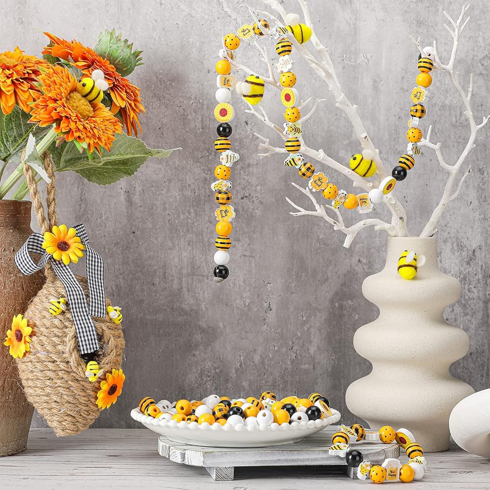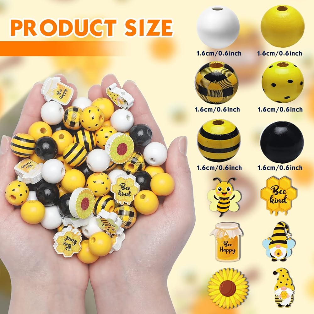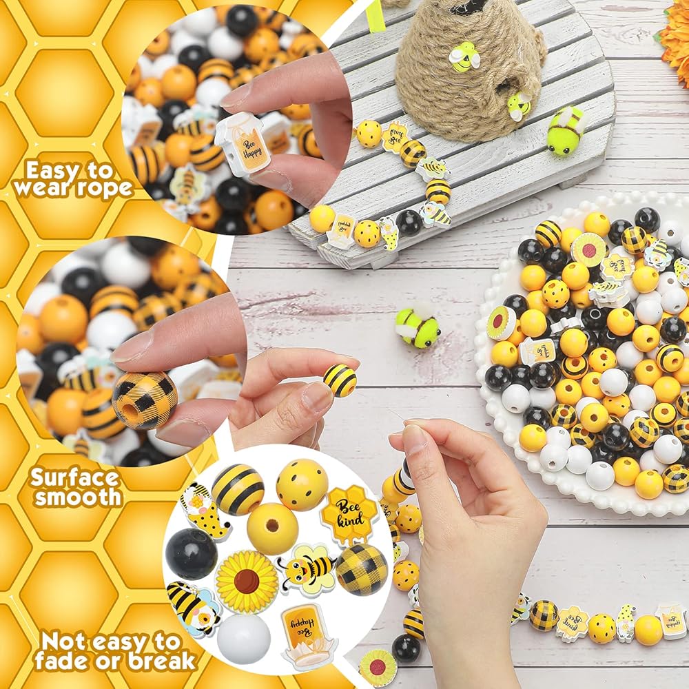 موضوع النحل الصيفي: الألوان الرئيسية لهذه الخرز الخشبي الحرفي المزرعة الصفراء ، أسود ، أبيض ؛ بعضها أنماط غير منتظمة ، مثل التماثيل الصغيرة التي تحمل قرص العسل في اليدين والنحل وعباد الشمس وما إلى ذلك