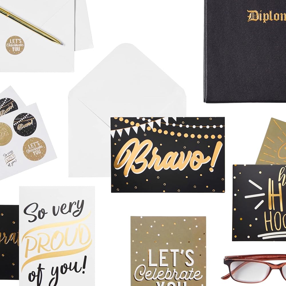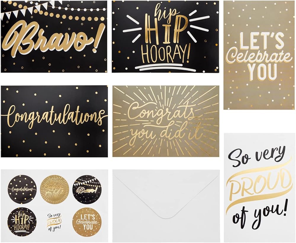 6 Assorted Designs: Find the perfect good luck card for an upcoming graduation or bridal shower cards for the bride; these festive greeting cards includes 6 shiny black and gold designs