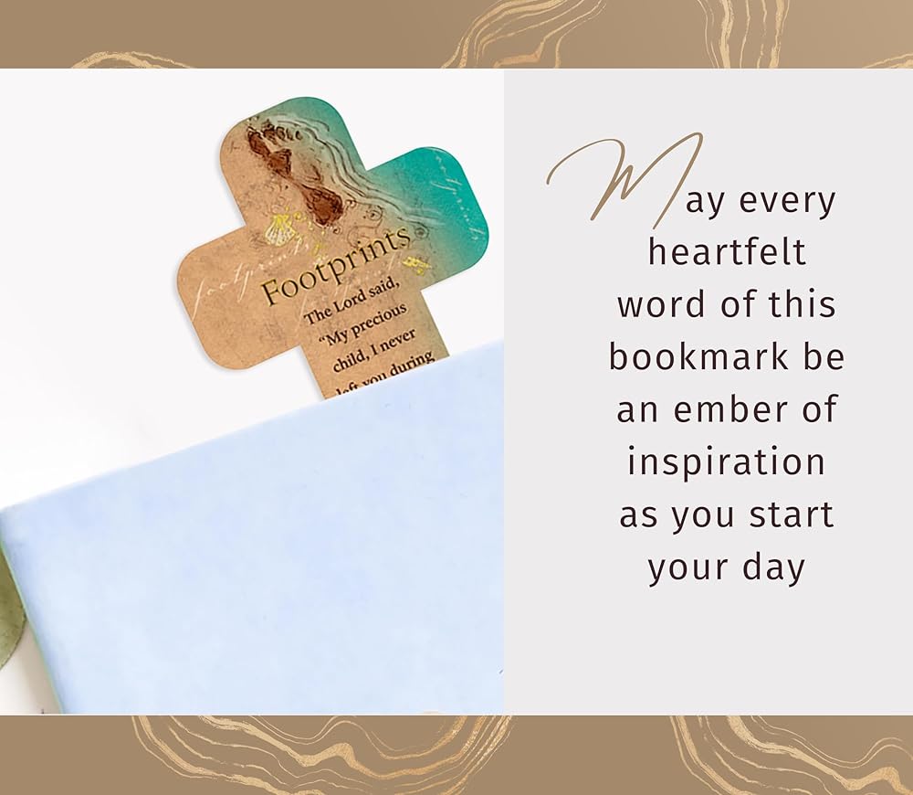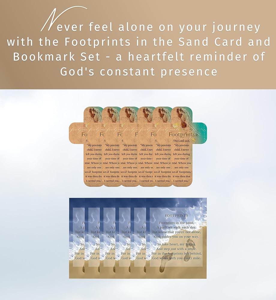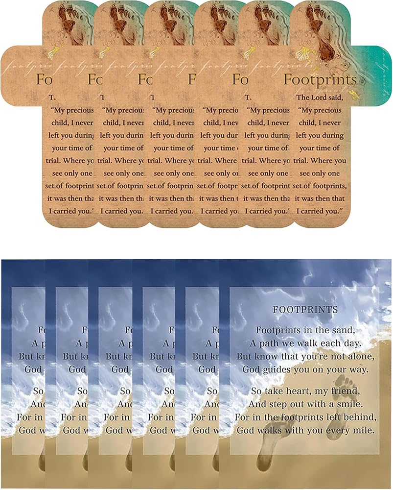 Discover the unique footprints in the sand bookmark bulk set of 12 inspirational cards, a thoughtfully curated collection designed to remind you of heavenly presence and unwavering support on life's journey. These footprint prayer cards and bookmarks symbolize belief and comfort, offering a timeless message of companionship and reassurance that an unseen hand walks beside you, even in your darkest hours. Perfect for conveying sentiments of trust and solace, the footprints poem bookmark makes a meaningful gift for loved ones facing challenges or seeking spiritual guidance. Whether placed in a book, displayed on a desk, or gifted in bulk to support your community, each card acts as a beacon of light and a testament to faith. Ideal for use in classrooms, churches, or personal collections, these footsteps in the sand bookmark and cards inspire reflection and meditation, helping individuals contemplate their religious journey and the presence of a higher power. Whether used for personal reflection or distributed to uplift others, the footsteps in the sand card collection embodies creed, resilience, and enduring hope. Share these timeless symbols with those you cherish and spread the gift of divine reassurance. Footprints In The Sand Card Size: 3.5" L x 3.23" W, Footprints Paper Cross Bookmark Size: 4.5" x 2.8"