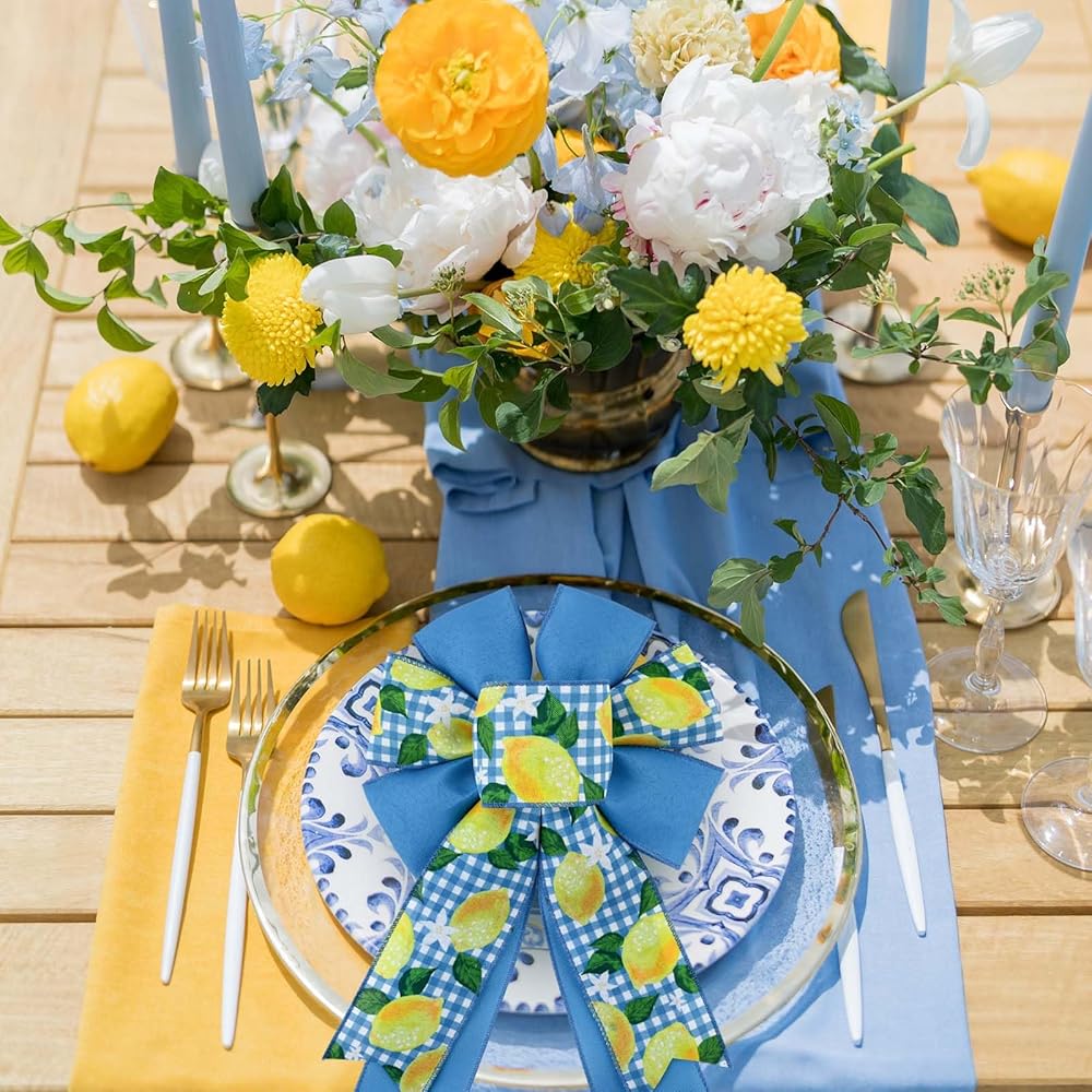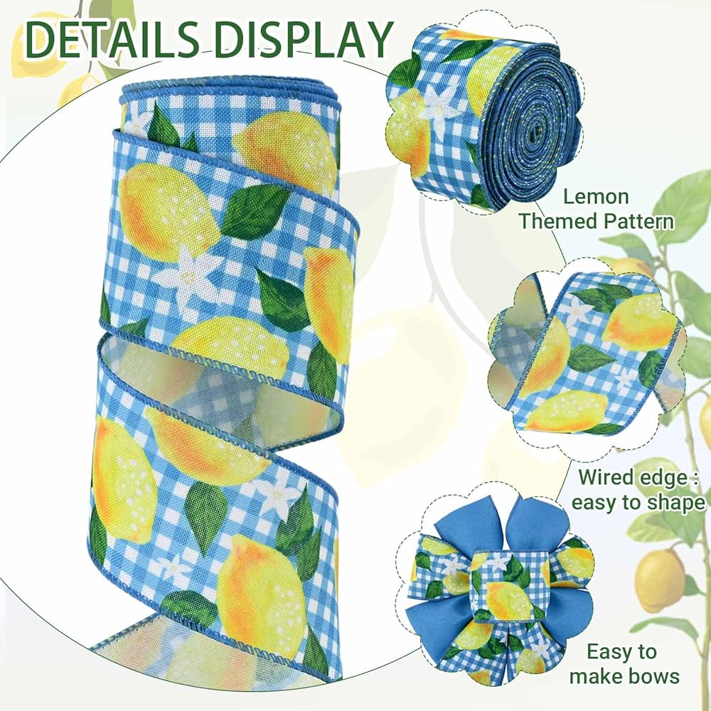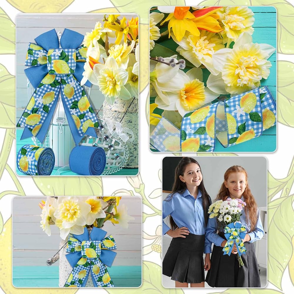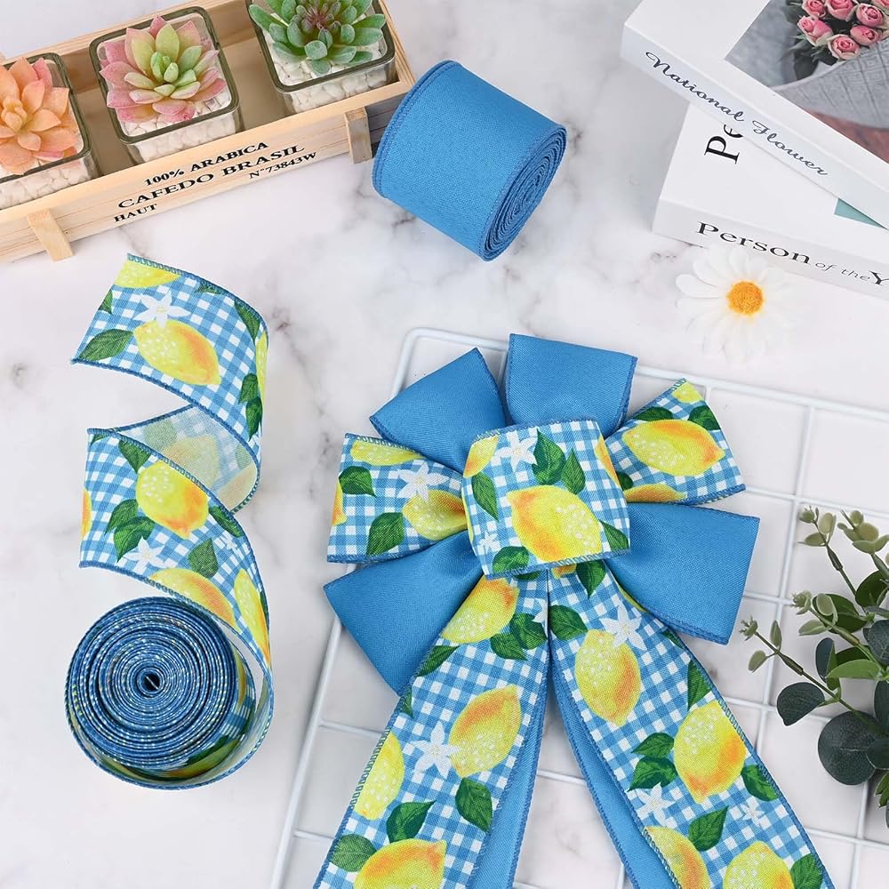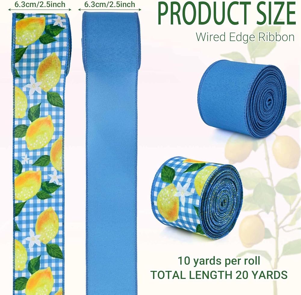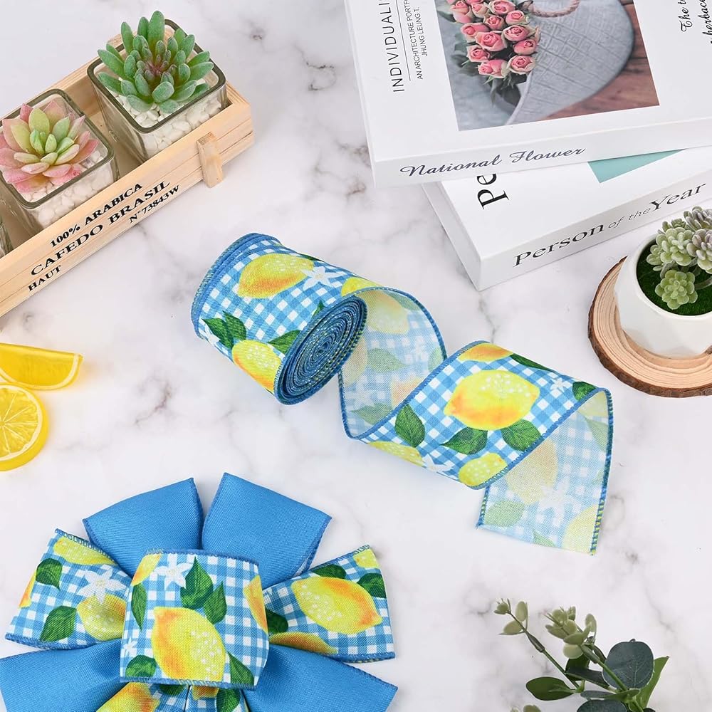 2 Rolls Lemon Wired Edge Ribbon Yellow Blue Summer Fruit Flower Printed Fabric Ribbon for Baby Shower Birthday for Gift Wrapping Wreath Bow Making Craft Supplies