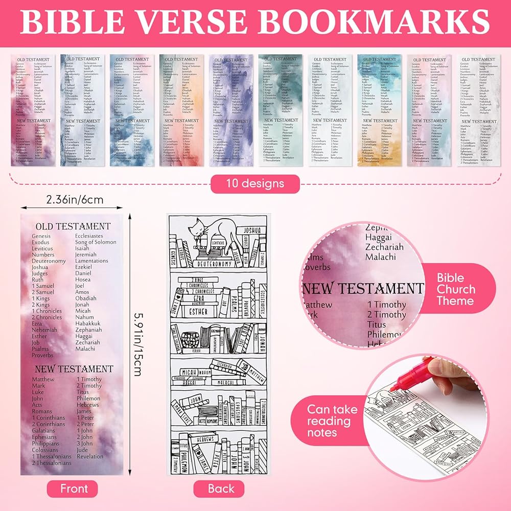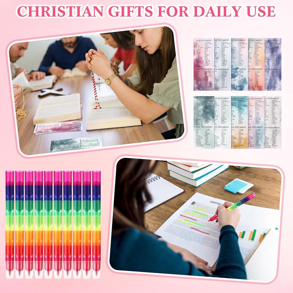 Inspirational Bible Verses Design: the Bible Verse Bookmarks have ten different beautiful backgrounds printed on the front, with Bible Verses, and solid color patterns and Bible Verses printed on the back; They can be used as Bible study supplies, Sunday school gifts, church gifts, and the matching Stackable Rainbow Color Highlighters are suitable for taking notes at any time