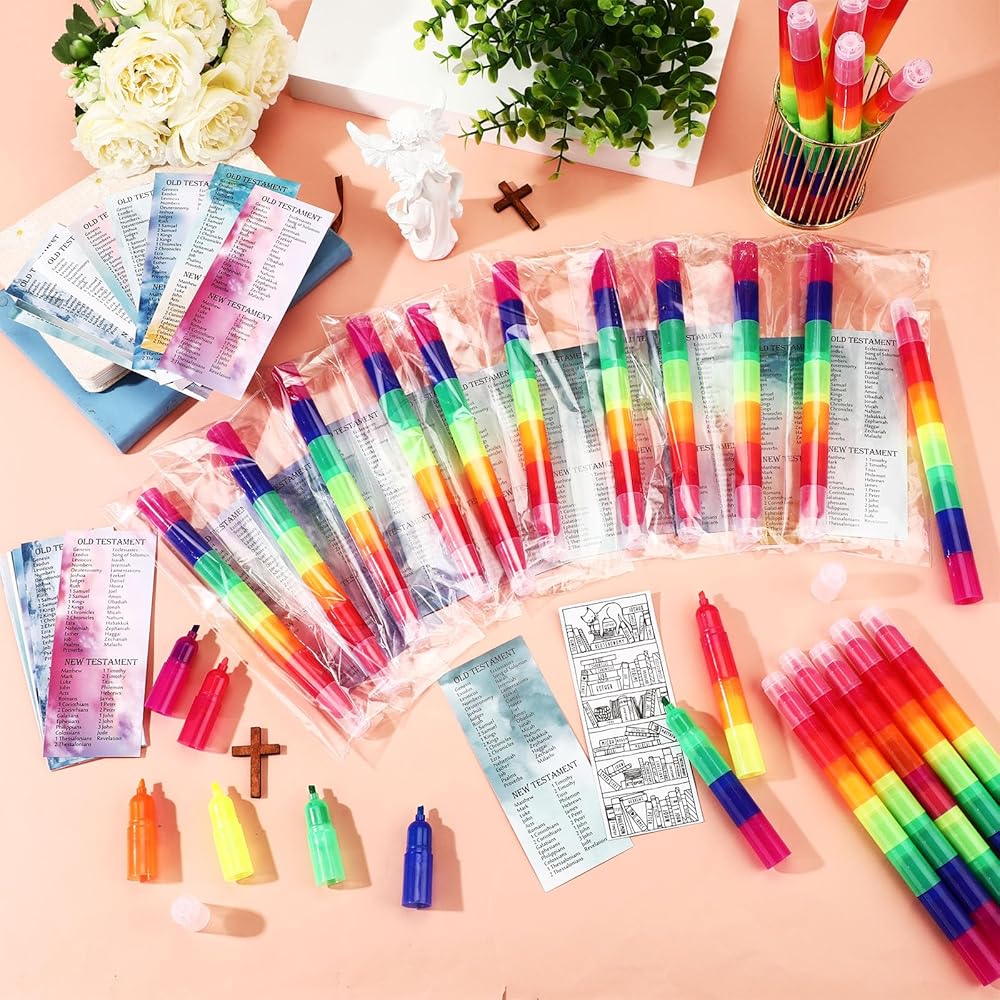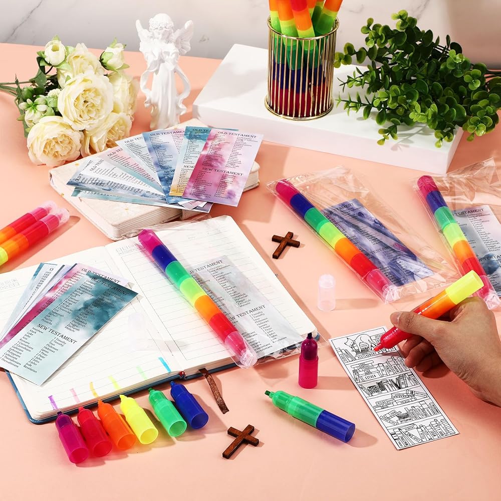 Durable Material: the Stackable highlighter is made of plastic, this rainbow stackable highlighter is sturdy and durable, not easy to bend or break, the pen body is brightly colored, so it can ensure practicality; Bible Verse Bookmarks are made of double copper paper, double-sided printing, clear printing, and can be used for a long time