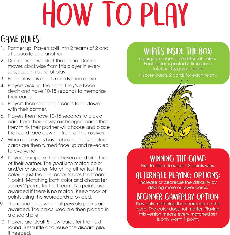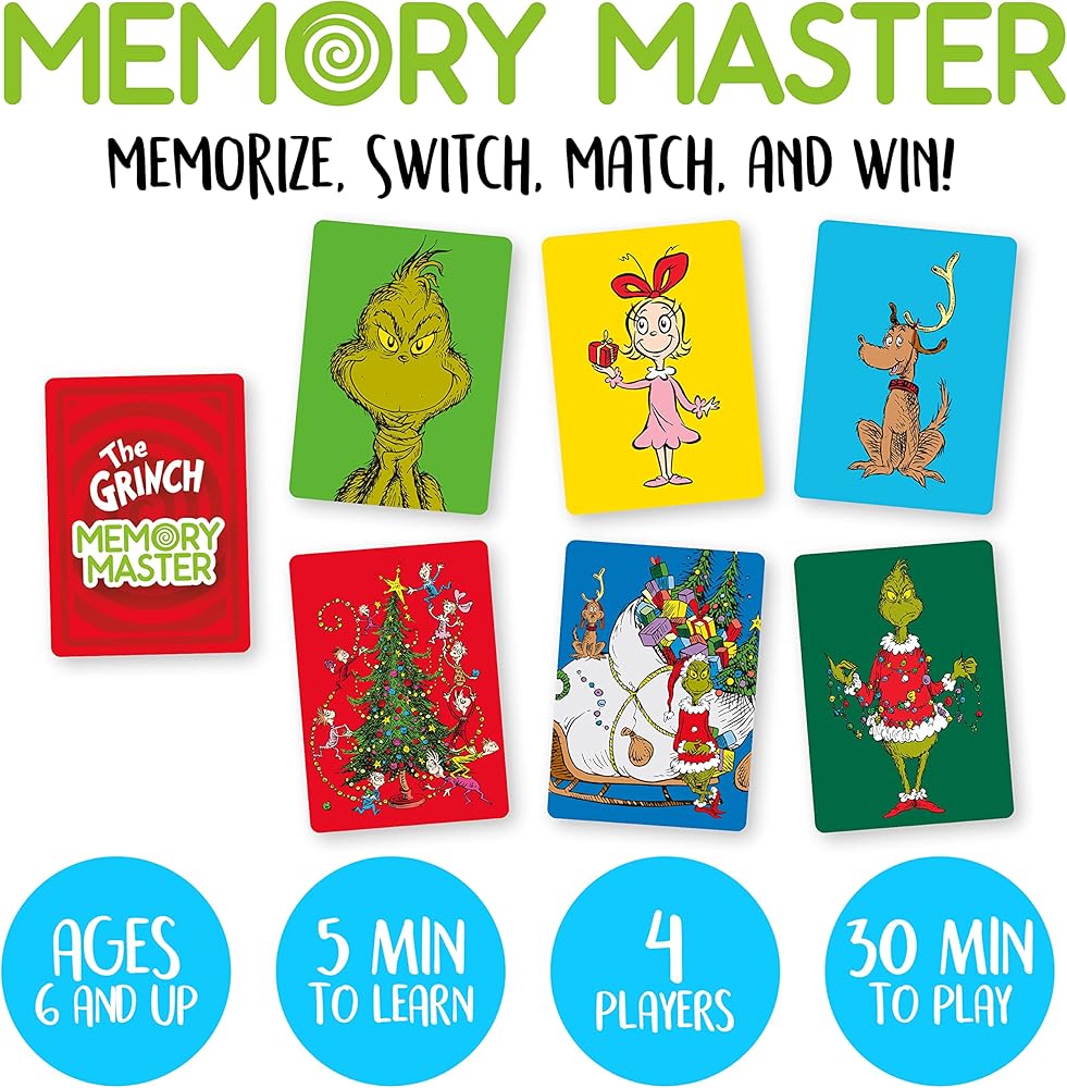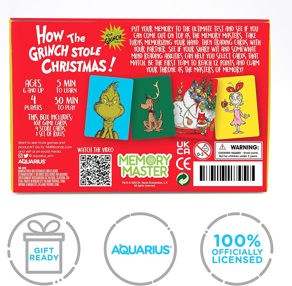A CARD GAME FOR THE WHOLE FAMILY: Put your memory to the ultimate test at at your next game night with this entertaining card game the whole family can enjoy. It features imagery from the classic Dr Seuss book, How the Grinch Stole Christmas. Could you be having any more fun?. MEMORIZE, SWITCH, MATCH AND WIN! Partner up and compete in a game of memory at home or on the go! | 5 minutes to learn the game | 30 minutes to play | 4 players (2 teams) | Ages 6 and up | Do you have what it takes to be crowned the Memory Master? LOOKING FOR GRINCH GIFTS? This How the Grinch Stole Christmas card game is the ultimate Grinch Gift for fans of all ages. Perfect gift for birthdays, white elephant, stocking stuffers and Winter Holidays 100% OFFICIALLY LICENSED GRINCH MERCHANDISE: The How the Grinch Stole Memory Master Card Game is designed by AQUARIUS and officially authorized. It's the perfect piece of Grinch memorabilia to add to your collection
