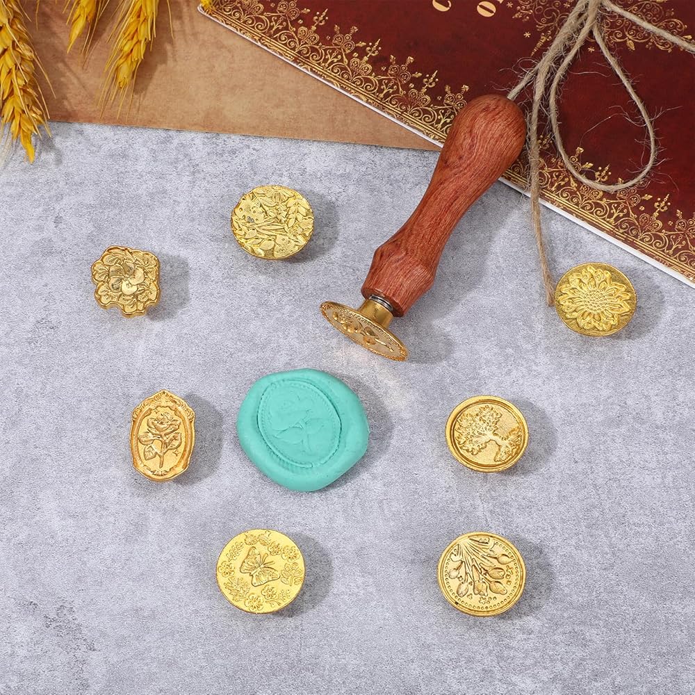 8 PCS WAX Seal Seal Kit ، ختم الشمع عتيق ، رأس ختم شمع النباتات الزهرية ومقبض خشبي ناعم للأظرف بطاقات دعوات الزفاف بطاقات المعايدة وهدايا اليومية