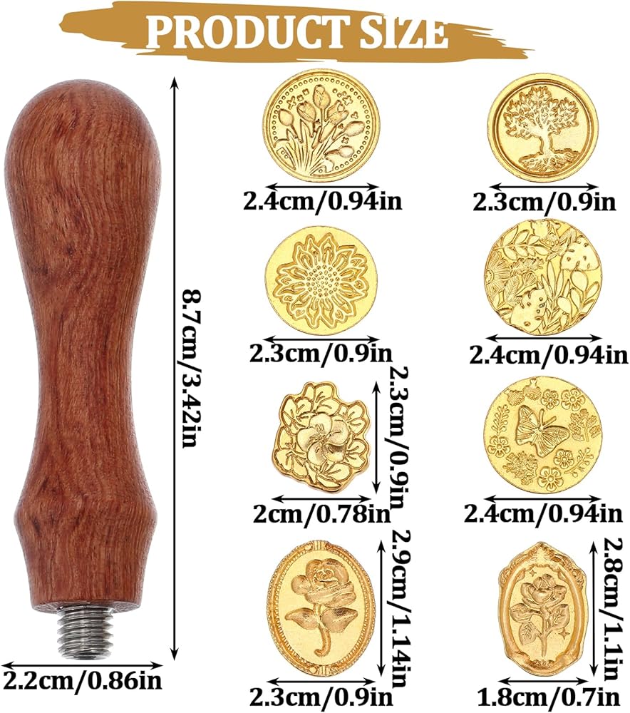 • [Packaging Overview] The wax seal stamp set contains 1 elegant wooden handle and 8 wax seal stamps. The diameter of the round wax stamp is about 2.4 cm/0.94 inches. The sizes of the other three flower wax stamps are: 2.9x2.3cm/1.1x0.9inch, 2.3x2cm/0.9x0.8inch, 2.8cmx1.8/1.1x0.7inch,the size of handle is 8.7*2.2cm/3.4x0.8inch