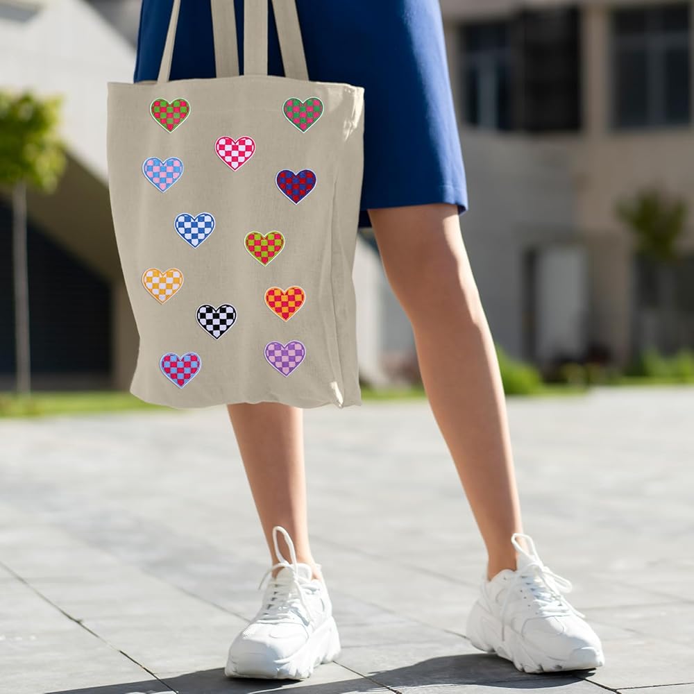Enhance your wardrobe and accessories with our 12-piece set of Checkered Heart Patches. These stylish iron-on patches are perfect for repairing or adding a decorative touch to various clothing items.