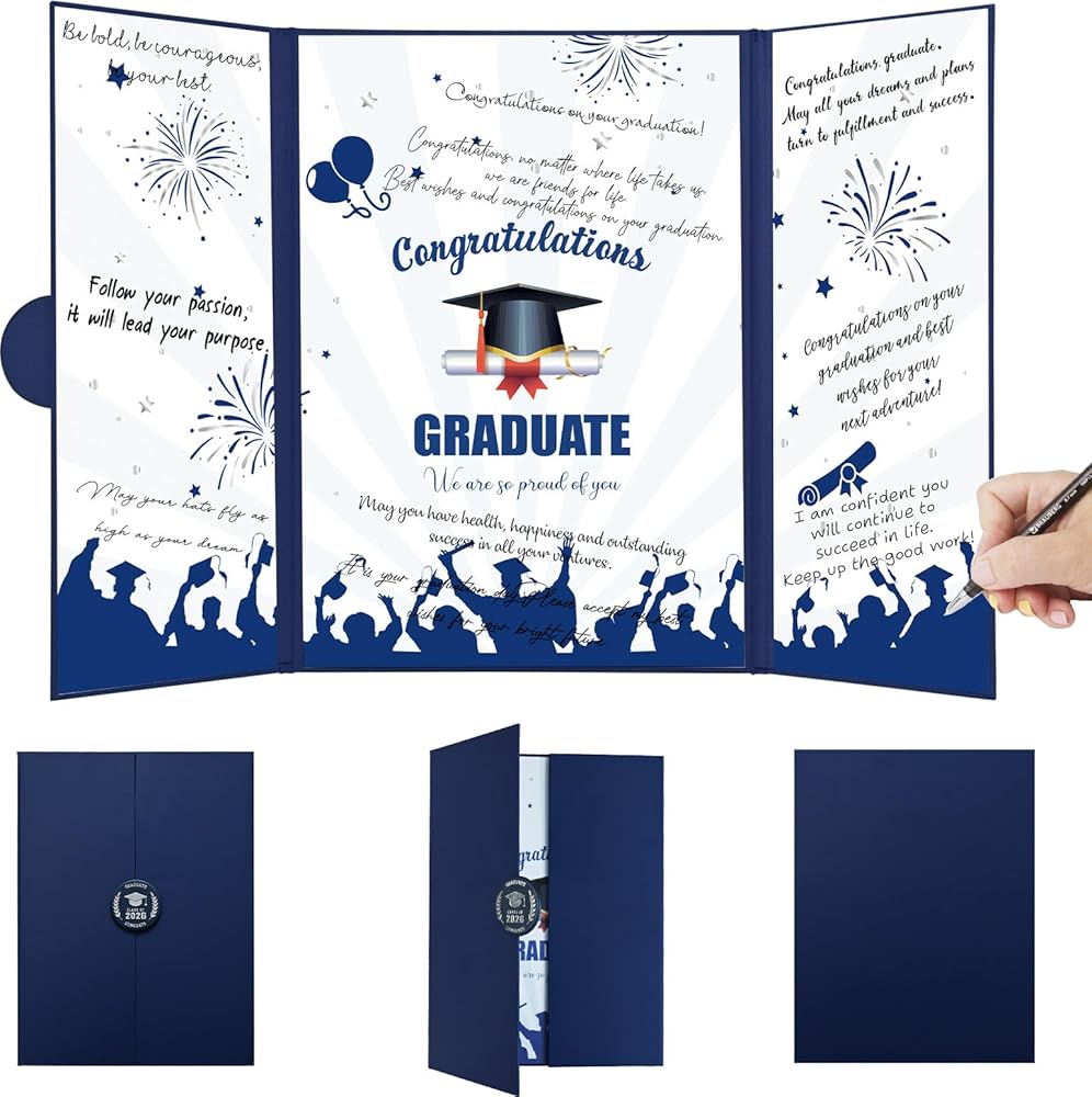 تصميم رائع: غلاف دفتر ضيوف التخرج الأزرق مزين بشارة مذهب. يتم تقسيم الجزء الداخلي من كتاب التوقيع إلى ثلاثة أقسام ، مع عبارة "تهانينا خريج" المطبوعة على الصفحات الوسطى. يضيف الشعار الدائري على الغلاف الشكلية ولمسة كلاسيكية إلى كتاب التوقيع بأكمله. لا يتطلب لوحة توقيع حزب التخرج الأزرق الداكن أي تجميع ويمكن فتحها مباشرة ، وقف على طاولة.