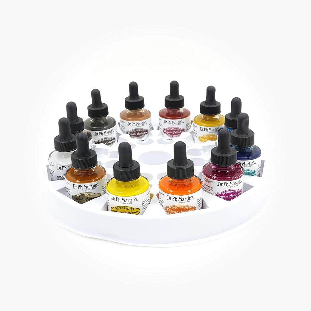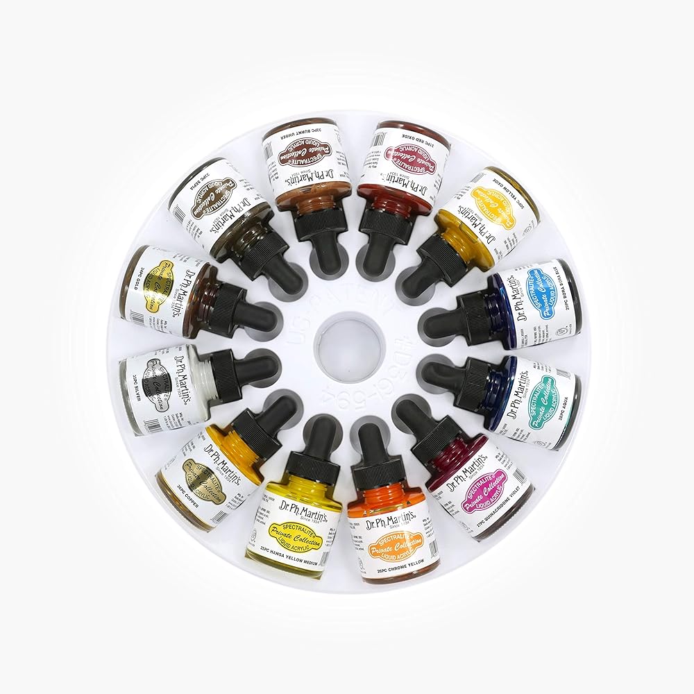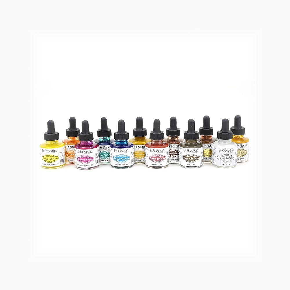 Dr. Ph. Martin's spectra lite private collection liquid acrylics are the brilliant, lightfast, waterproof acrylics that flows like watercolor. Our permanent, archival grade fine art color is made with the finest ground pigments sourced from around the world. Excellent on paper or canvas, spectra lite can also be used on board, wood or metal. Works for illustration, calligraphy pens, airbrushing, designing and technical pens. Dr. Ph. Martin's spectra lite private collection liquid acrylics are now available in three different sets with a total of 36 unique colors to choose from. Each set includes 12 different colors in 1.0 oz (30ml) bottles with droppers and a custom mixing palette. With its unique properties and a dynamic range of color unlike anything else on the market, spectra lite delivers unparalleled Vibrance, detail, and control with every mark. Set 3 colors: 25Pc handsaw yellow medium, 26Pc chrome yellow, 27Pc Quinacridone Violet, 28Pc aqua, 29Pc Bora Bora blue, 30Pc yellow oxide, 31Pc red oxide, 32Pc burnt Umber, 33Pc sepia, 34Pc gold, 35Pc silver, 36Pc copper.