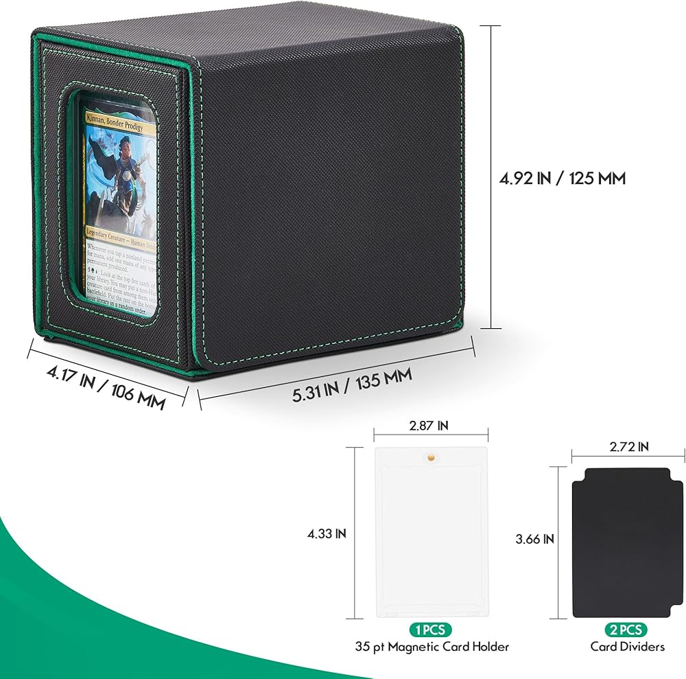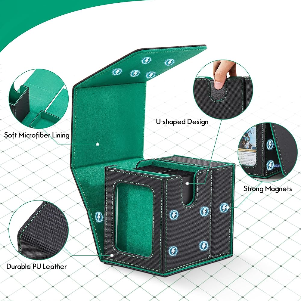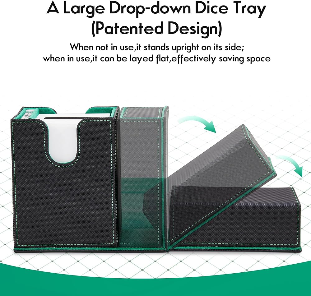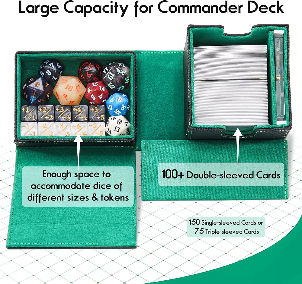 • سعة واسعة: يمكن أن يحمل صندوق قائد MTG هذا 100+ بطاقات مزدوجة الأكمام أو 150 بطاقات واحدة من الأكمام أو 75 بطاقات ثلاثية الأكمام لحماية إضافية ؛ صينية زهر كبيرة منسدلة تخزن بسهولة العدادات والرموز