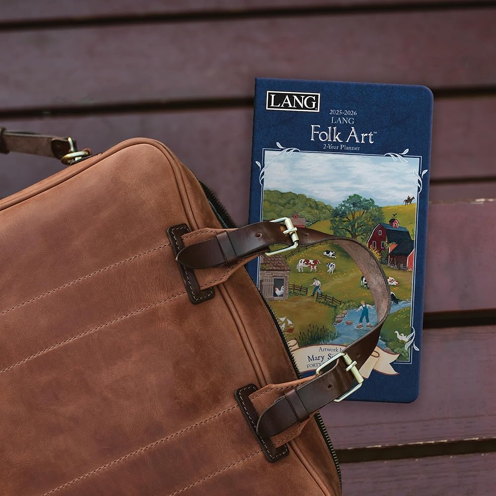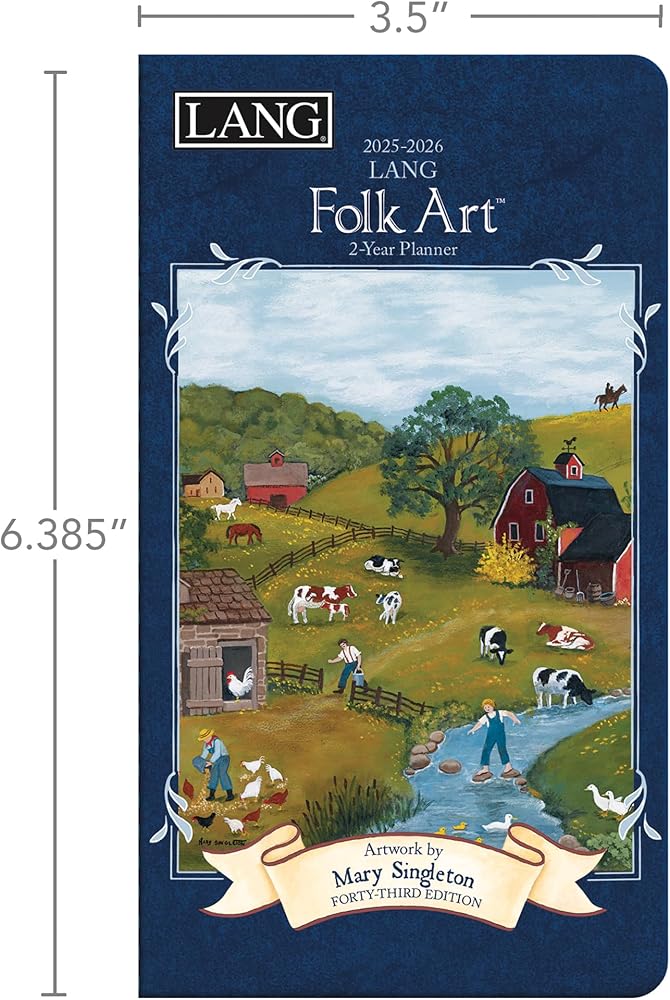 Plan up to 24 months ahead with the LANG Folk Art 2025 2-Year Planner, featuring clear protective cover, and monthly folk art by Mary Singleton of townspeople in the rural countryside enjoying seasonal activities on every page.