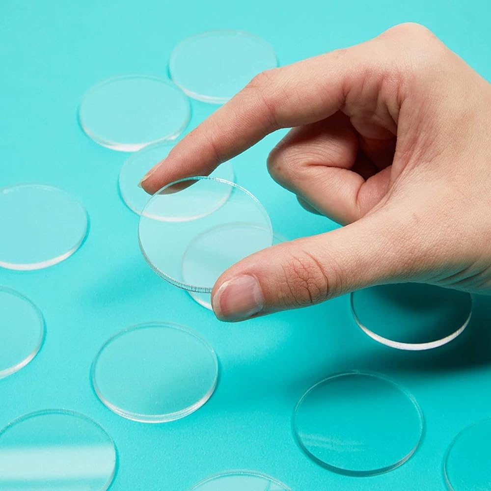 Clear Acrylic Discs: Draw, engrave or paste custom designs onto these thick acrylic disks to create your own signs and artwork; the smooth, transparent surface allows for easy customization