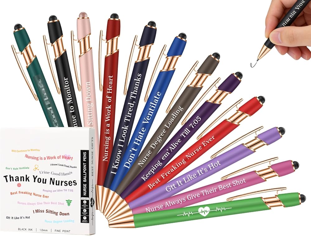 2-in-1 Design Stylus Nurse Mors: 12 Under Stylus Point Pens في أنماط مختلفة ، والتي لديها أقوال الممرضة اللطيفة ، الرائعة والعملية ، بما يكفي لتلبية احتياجات الاستخدام والاستبدال. إحدى الطرفين لديه قلم حساس ، والطرف الآخر مجهز بنقطة حبر أسود عالية الجودة للاستخدام المريح ؛ اضغط على قمة القلم القلم لتمديد القلم لكتابة تدفق الحبر السلس والطويلة الأمد.