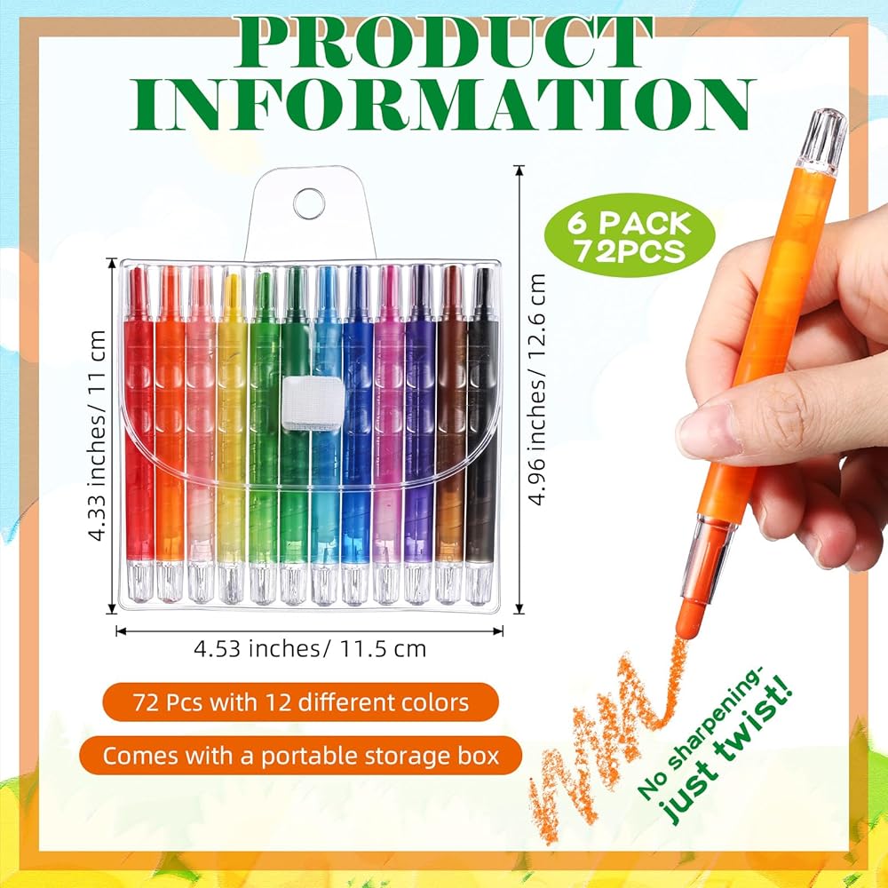 Large Capacity Combination: you will receive 6 sets of colored crayons, 12 pieces each, 72 pieces in total, sufficient quantity, ideal for classroom projects, family craft activities, and can also be applied as party gifts or surprise gifts in gift bags to meet the needs of multiple people for use or creation