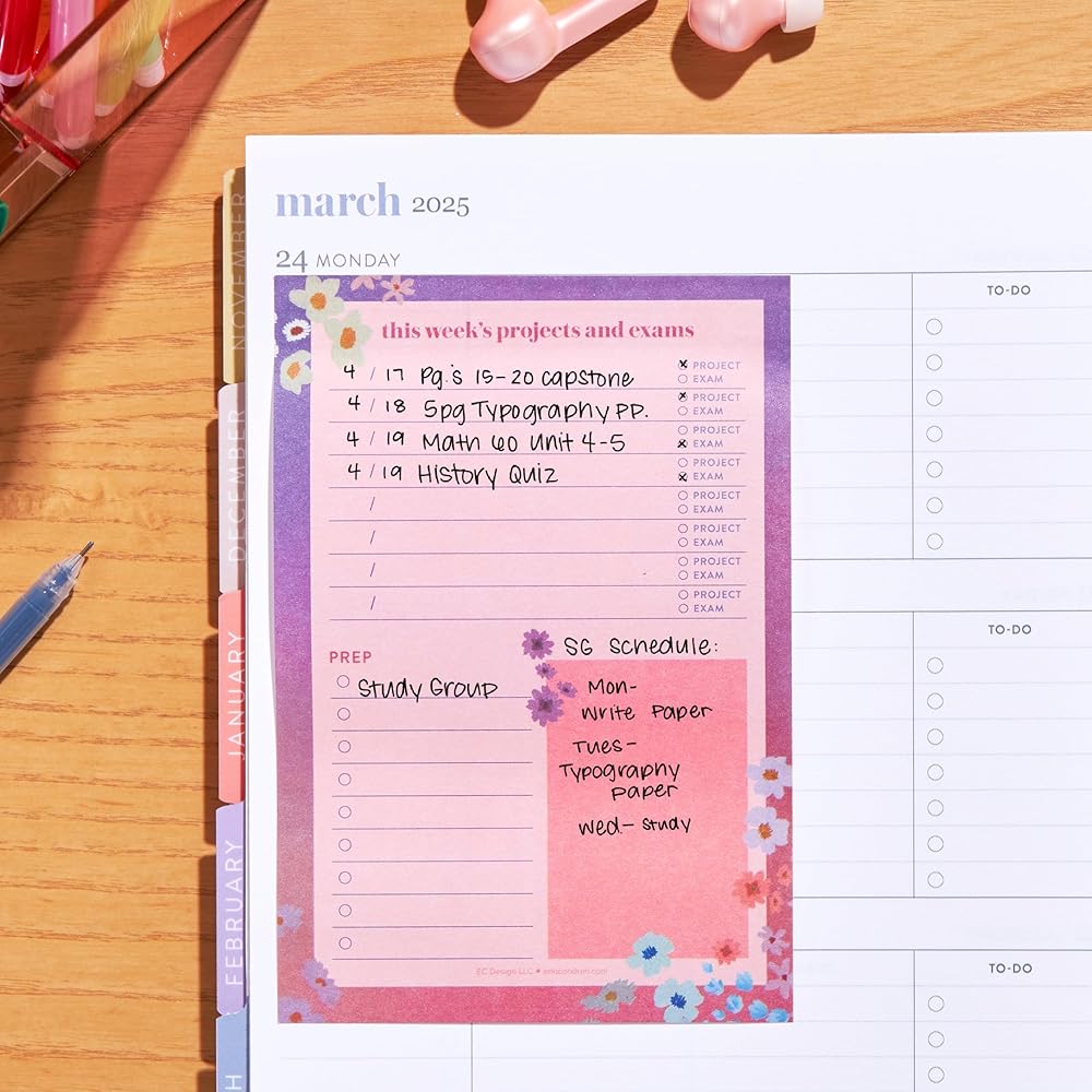 Never fall behind on a project or forget to study for an exam again with the Weekly Projects and Exams Sticky Notepad! Log and track all your projects and exams, week by week. Perfect for staying organized and prepared while reducing stress. Founded in 2005, Erin Condren is a leading lifestyle brand known for creating fun and functional organizational essentials for the home, office and everything in between. From personalized planners, calendars and notebooks to desk accessories, bags and more, each product is designed in the USA and intentionally crafted to help customers get organized, reduce stress and lead more fulfilling, meaningful lives through organization. Erin Condren accessories are built to last and thoughtfully designed with style and functionality for a premium product experience. Their team is female-led, exceptionally diverse and over 200 strong. They enjoy creating and using fun and functional products that empower, motivate and inspire people around the world to turn their dreams into plans and their plans into reality. Customers rely on Erin Condren organizational solutions to focus on what matters most and make the most of every day.