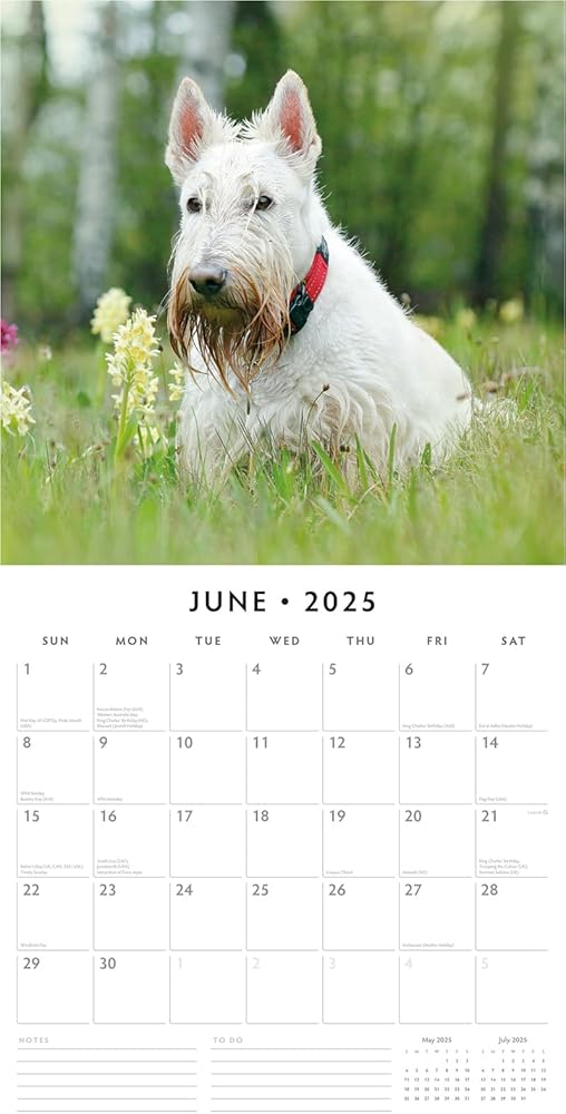 This calendar also includes holidays and observances, astrology dates, religious events, and plenty of space for notes and to-do lists, helping you stay organized while celebrating the bold and brave personality of Scottish Terriers.