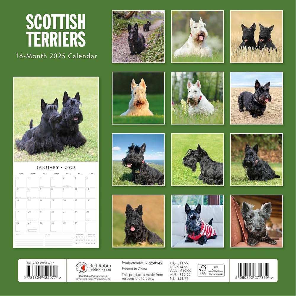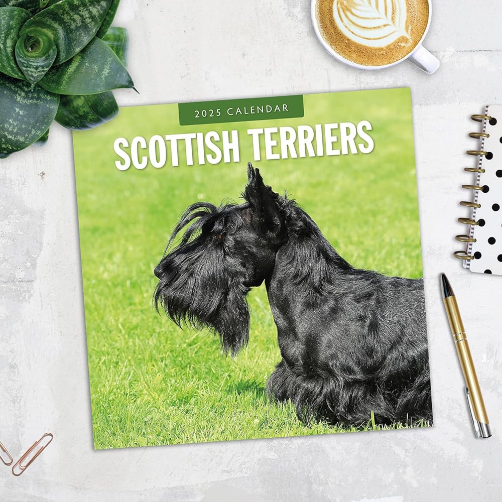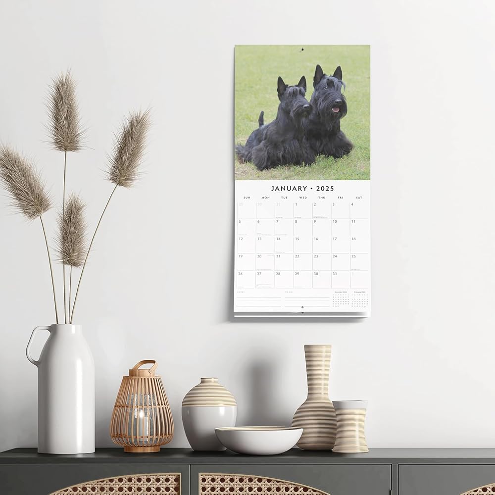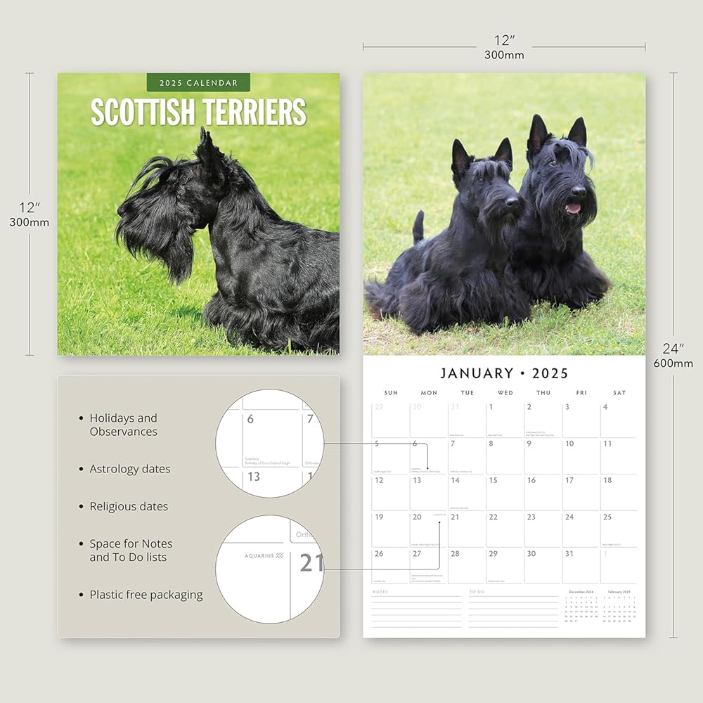 Celebrate the independent and fearless spirit of Scottish Terriers with the 2025 'Scottish Terriers' wall calendar. Sized at 12" x 24" open and printed on premium thick & sturdy paper, this calendar captures the proud and dignified nature of these small yet sturdy dogs. Known for their distinctive wiry coats, sharp expressions, and trademark beards, Scottish Terriers, or "Scotties," are beloved for their loyal and bold personalities. Each month showcases their confidence and alertness, whether they're patrolling the yard, digging with determination, or enjoying time with their families. Perfect for fans of this iconic breed, this calendar brings the unique charm of Scottish Terriers to your home all year long.