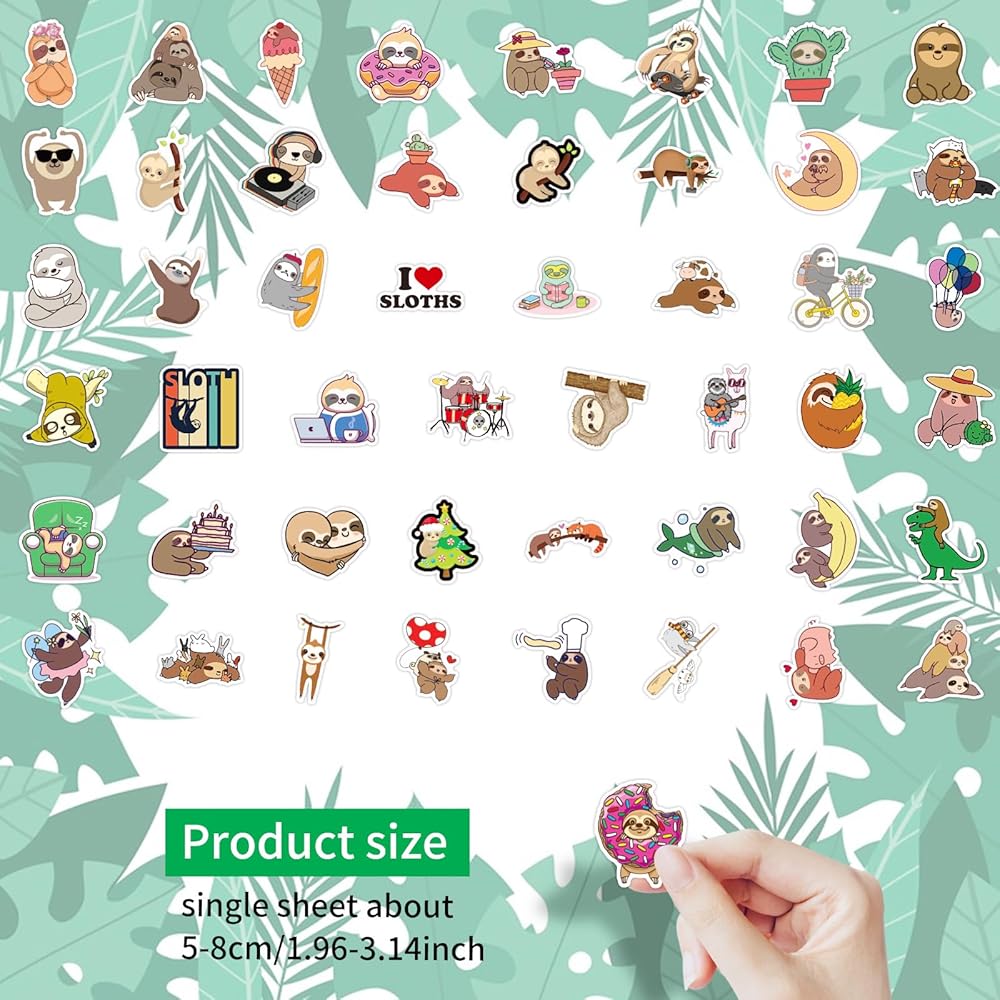 【Cute Cartoon Stickers】Our sloth decal Kits include an impressive assortment of 100 uniquely designed, cute sloth stickers. With no duplicates, you'll have a wide variety of charming sloth designs to choose from, ranging in size from 5-8cm (1.96-3.15in). This ample quantity and assortment ensure that you'll find the perfect animal stickers for all your decoration needs.