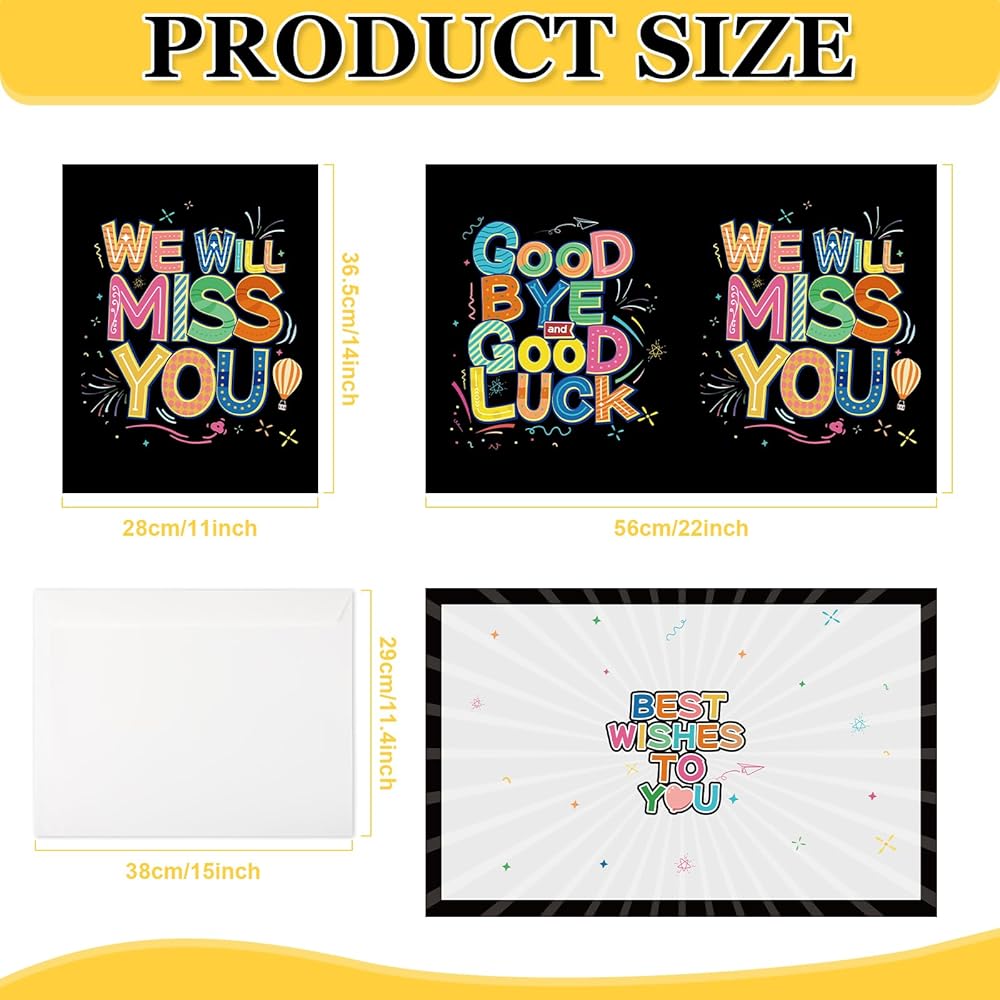 【Exquisite Design】: The two sides of the card are printed with different contents, respectively, "Wish you all the best, goodbye and good luck" printed on the inside page "Good luck", this farewell card is perfect for farewell and farewell party decoration. Included is a white envelope.