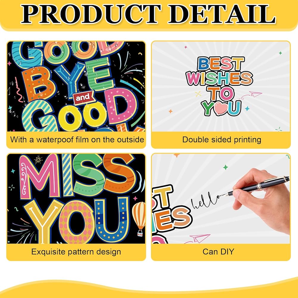 【Reliable Material】: The card is made of high quality materials. The inner layer of paper is white background color, easy to write smoothly. This good luck goodbye card is easy to save and carry, not easy to damage or deformation, this goodbye card is printed on both sides, the surface is covered with film, the pattern is clear, not easy to fade, can be stored for a long time.