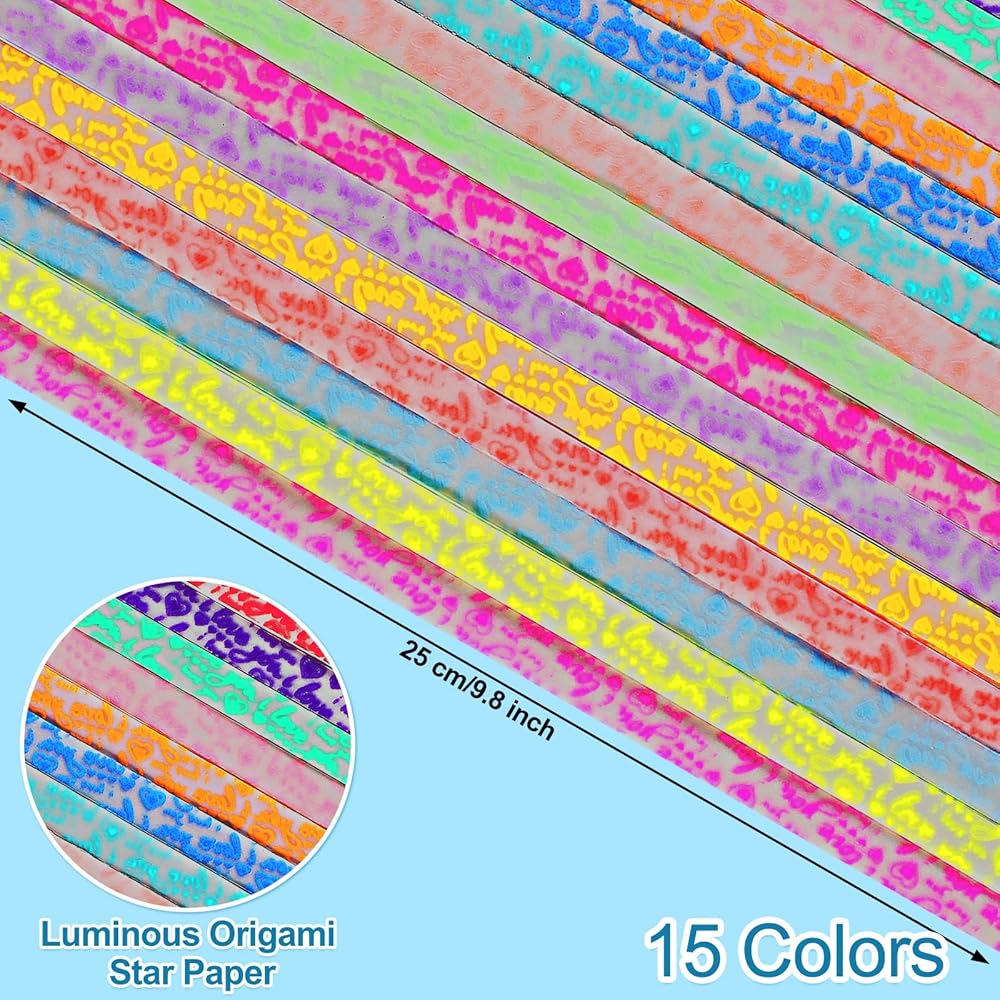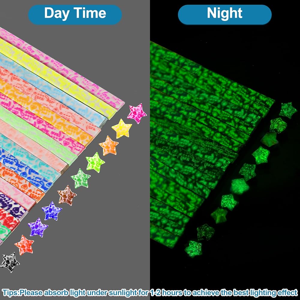 • Glow in the Dark: it is recommended to have the origami paper stars absorb light in a bright place for 10-20 minutes before use to achieve good luminous effect; When folding lucky star paper, the faces with luminous powder should be outwards
