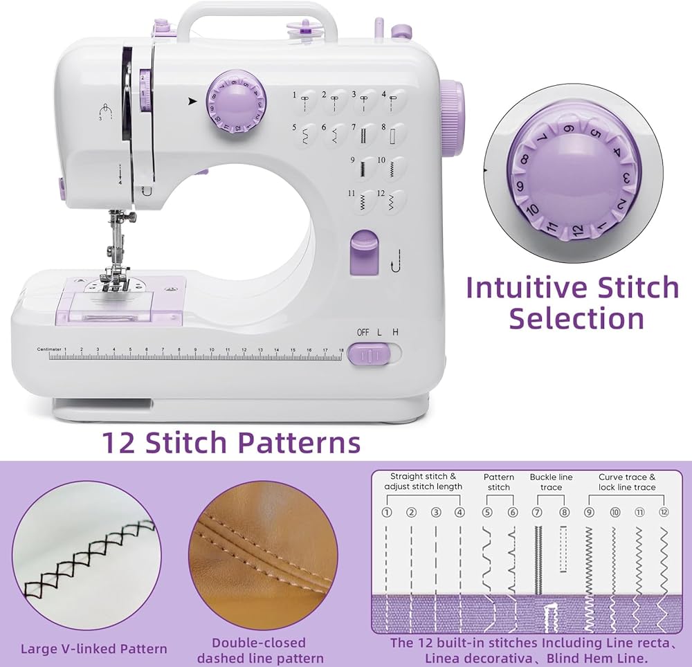 • Mini Sewing Machine: Our mini sewing machine has 12 kinds of stitches, 12 sewing stitches patterns to meet your different needs of DIY sewing, 1- 4 is the adjustment stitch length, 5/ 6 is the pattern stitch, 7/ 8 is the lock stitch, 9- 12 is a curve stitch, just adjust the knob to the corresponding number, you can use the corresponding stitch, which is perfect for a variety of fabrics, allowing you to sew pants, skirts, pet clothing, stuffed animals, curtains, pillows, tablecloths, etc