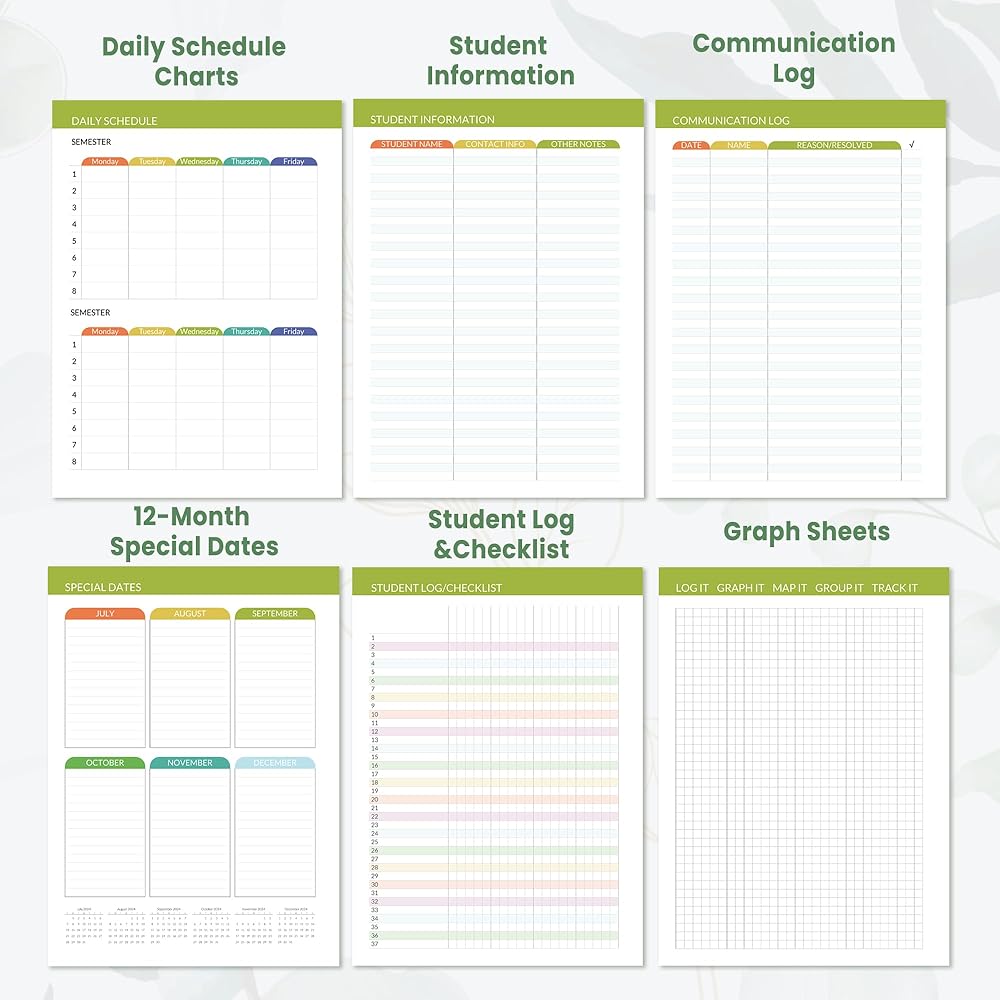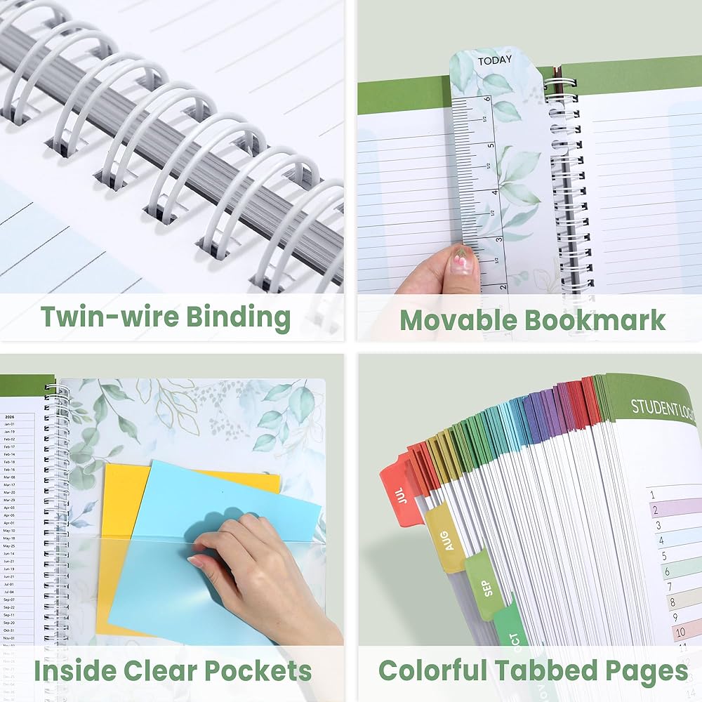 ميزات إضافية: تعزيز تجربة التخطيط الخاصة بك مع نظرة عامة على 2024-2026 | مرجع سريع | معلومات الطالب | سجل الاتصال | موعد خاص | Plans.goals.ideas | صفحات الرسم البياني | الجداول اليومية | سجل الطالب/قائمة المراجعة | تقويم العطلات | ملاحظة الصفحة | إشارة مرجعية وجيوب بولي مريحة لتخزين إضافي.