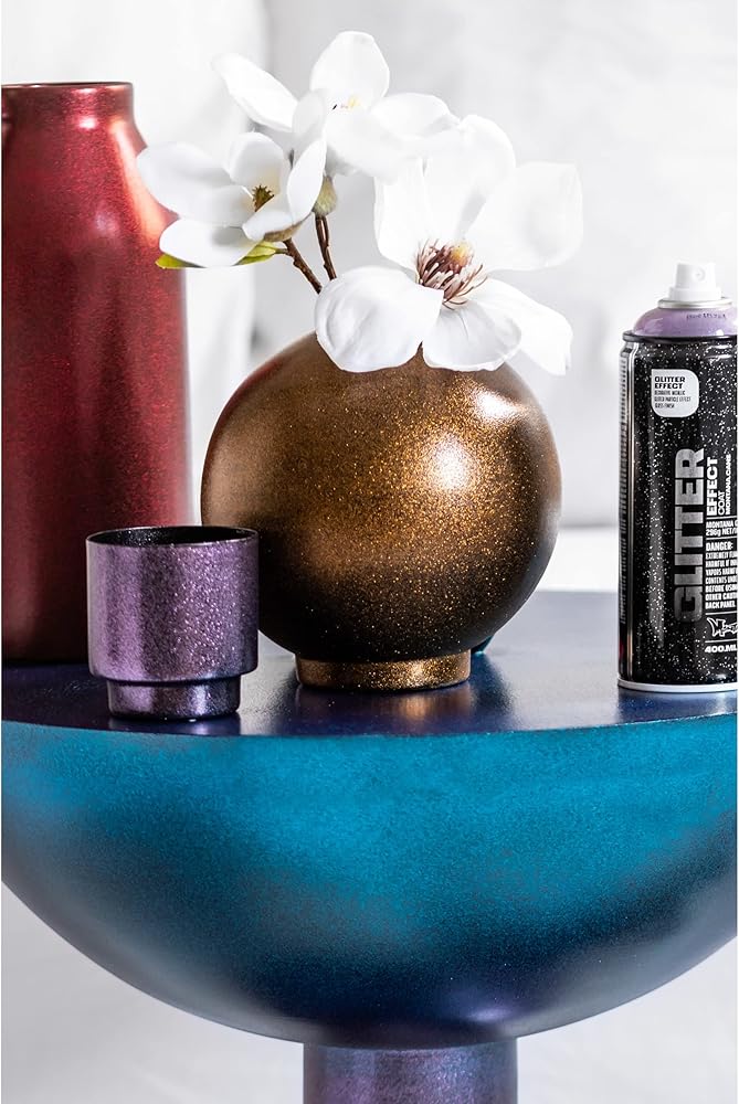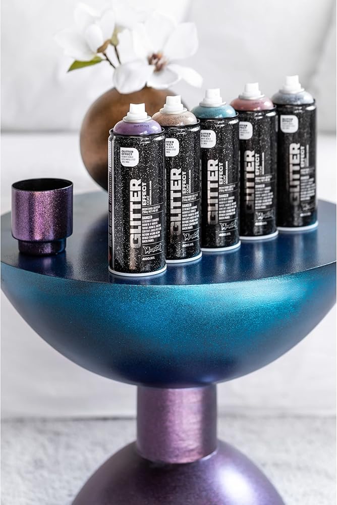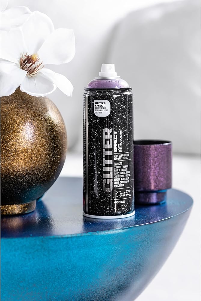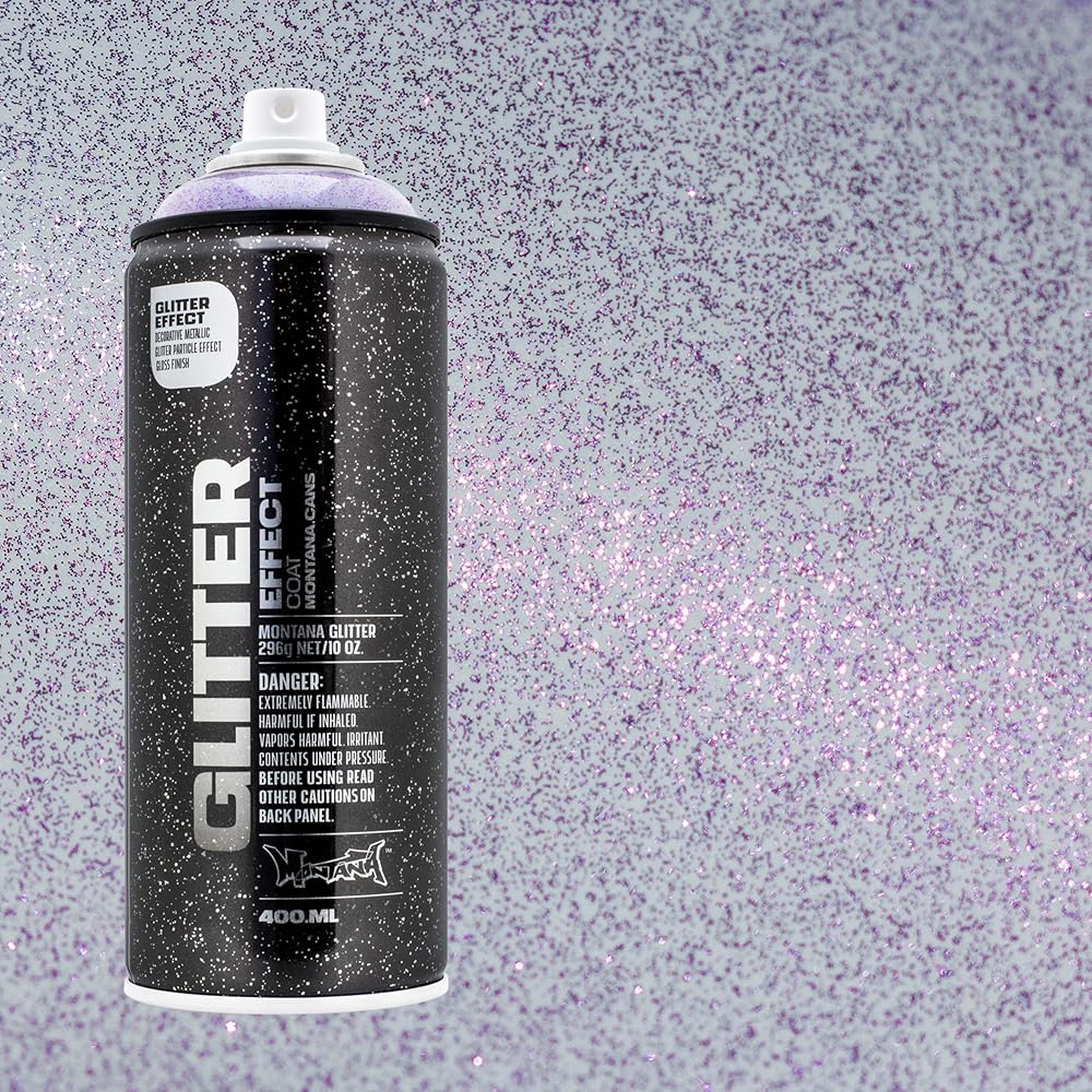 Montana Cans GLITTER EFFECT Spray offers high quality glitter coating that is refined and beautiful. Achieve stunning effects on objects and artworks of all kinds, whether you want to repaint your bike, create fine art or make greeting cards. Transform surfaces such as paper, cardboard, primed canvas, wood, glass, metal, ceramics, porcelain, stone, acrylic and other paintable materials. After being applied, a thin shiny lacquer coat will show with a fine distribution of glitter particles. This spray paint is light fast as well as scratch and dent resistant. Further coats will lead to a higher density of particles and intensify of the effect.