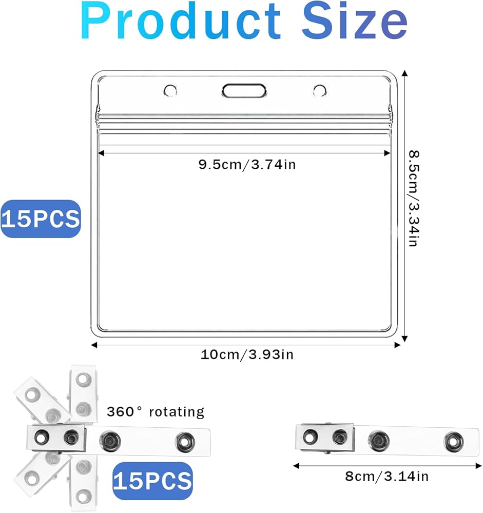 Package Contents: You will get 15 transparent plastic name tags and 15 sturdy metal clips. The size of the badge holder is 3.74" x 3.34" (L x W), with a large space layout, which can properly store important items such as business cards, ID cards, credit cards and business cards, and is very convenient for daily use.