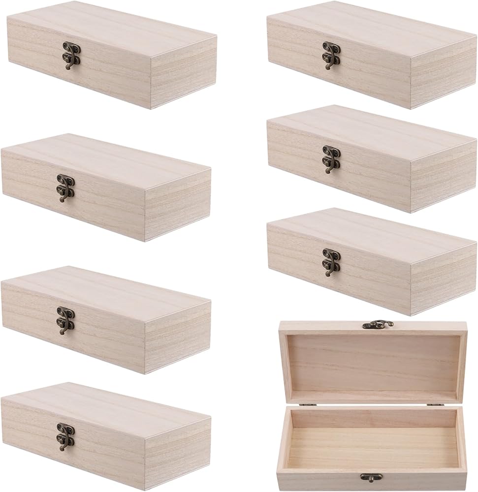 ●The 8-piece wooden box with hinged lid kit can meet your storage needs for various small objects, and they can also be used as gift boxes! Specification: