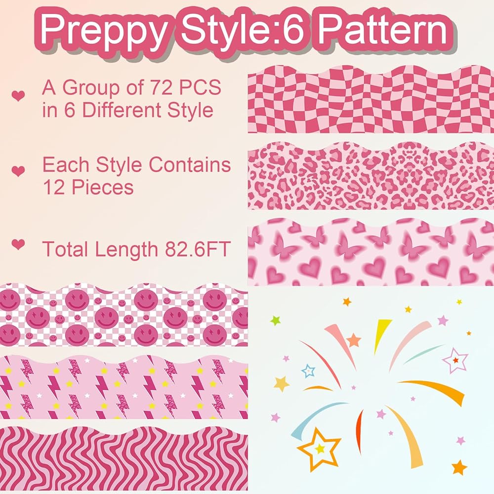 • Package Includes:72pcs Preppy theme bulletin border stickers in 6 designs, each design contains 12 pcs, abundant quantity can meet your decoration needs, and you can also share with family and friends.