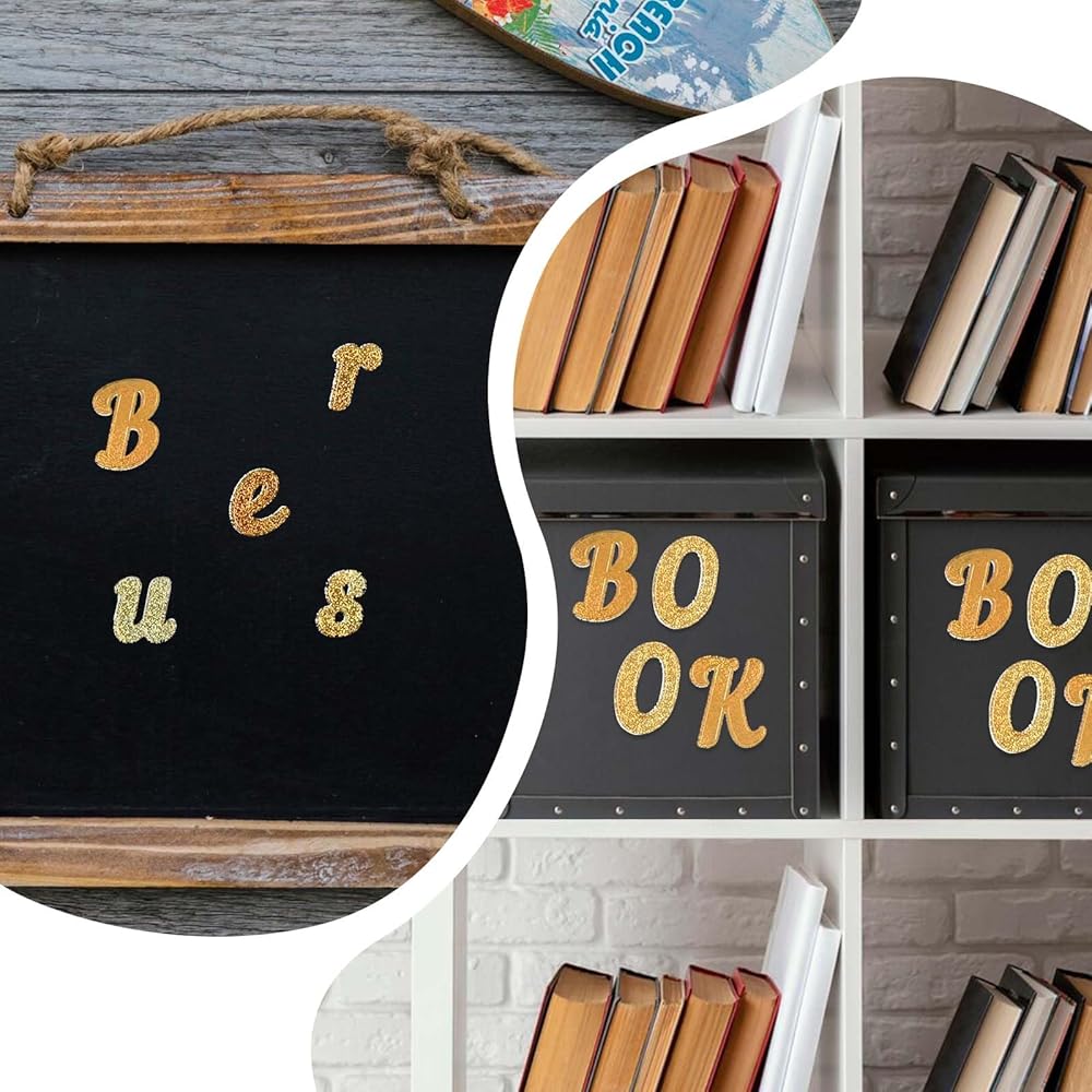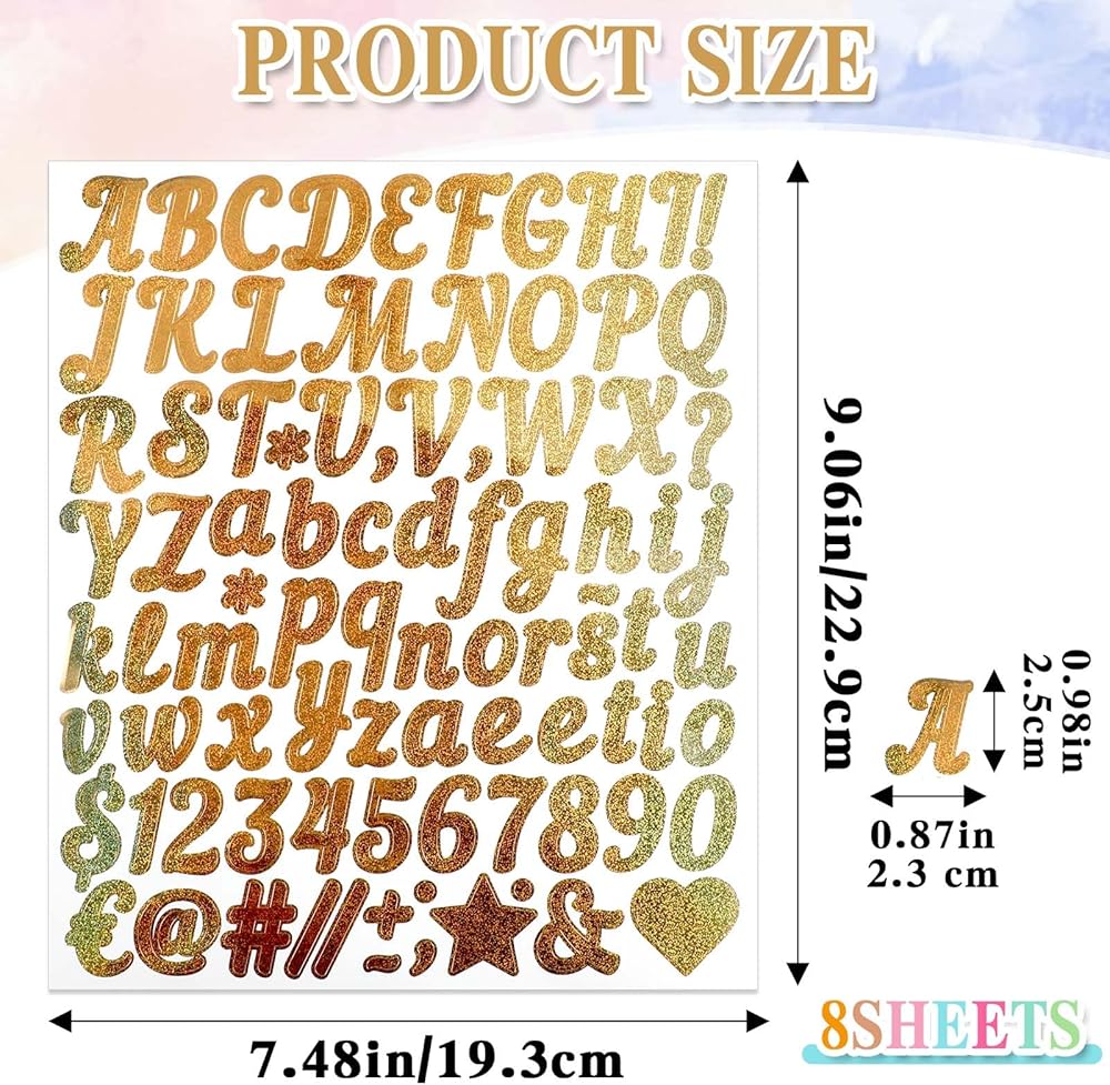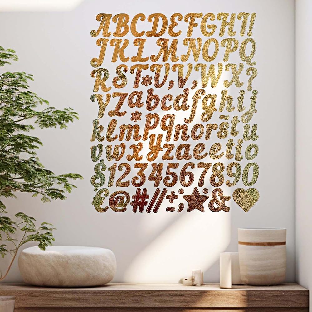 PREMIUM QUALITY: Our glitter letters stickers are made of high-quality vinyl material, ensuring they are shiny, bright, and hard to fade or tear. These gold alphabet letters are waterproof and UV resistant, suitable for both indoor and outdoor use, providing long-lasting adhesion.