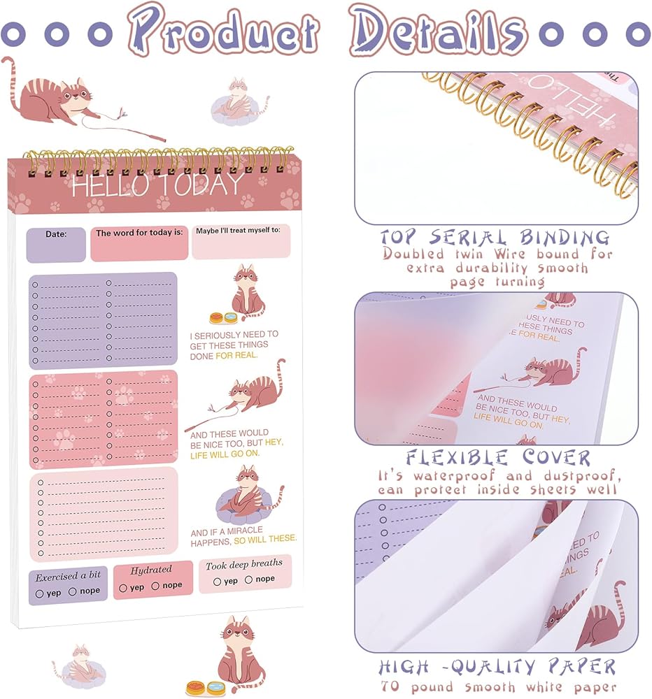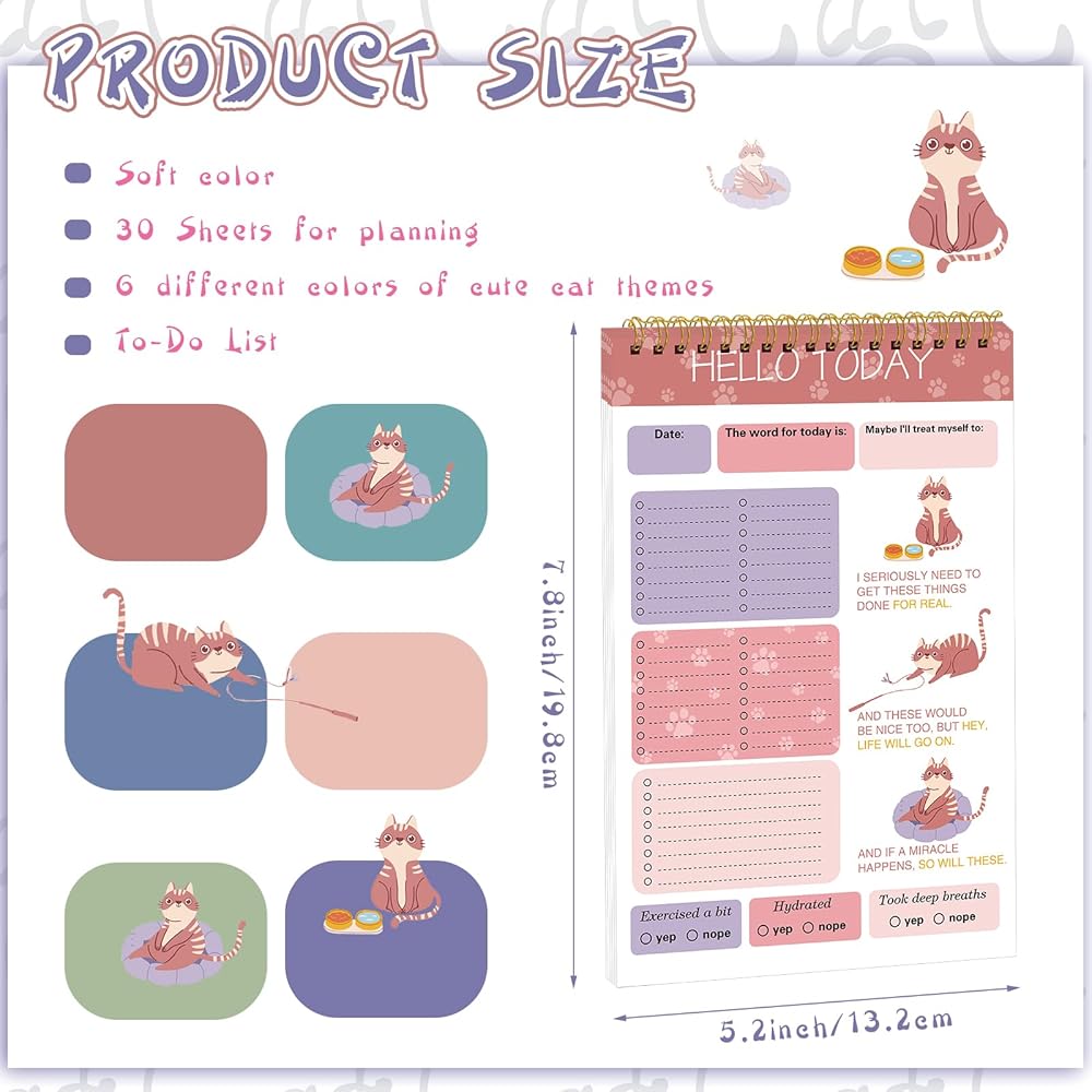 • Enough to Use and Share: you are provided with 6 pads of cute cat daily to do list notepads in the package, which are available in 6 different colors, 1 pad for each color, 30 sheets for each pad, 180 sheets in total; The abundant quantity and various colors can meet your use and replacement needs in daily life, and you can share them with your family, friends, and coworkers