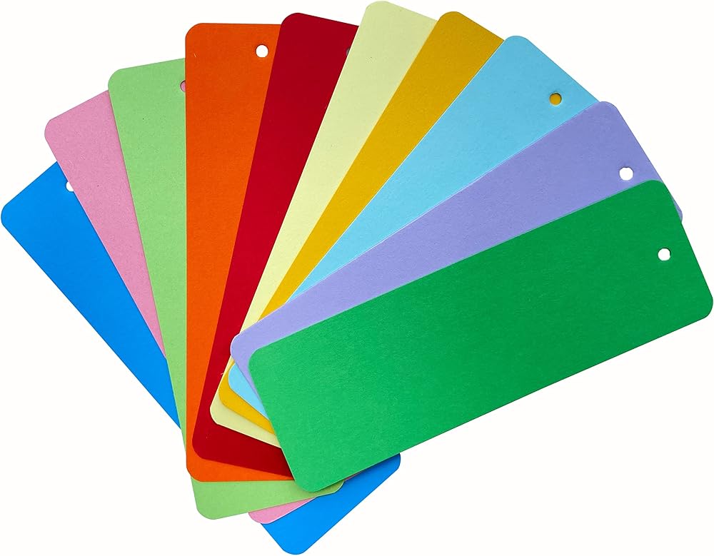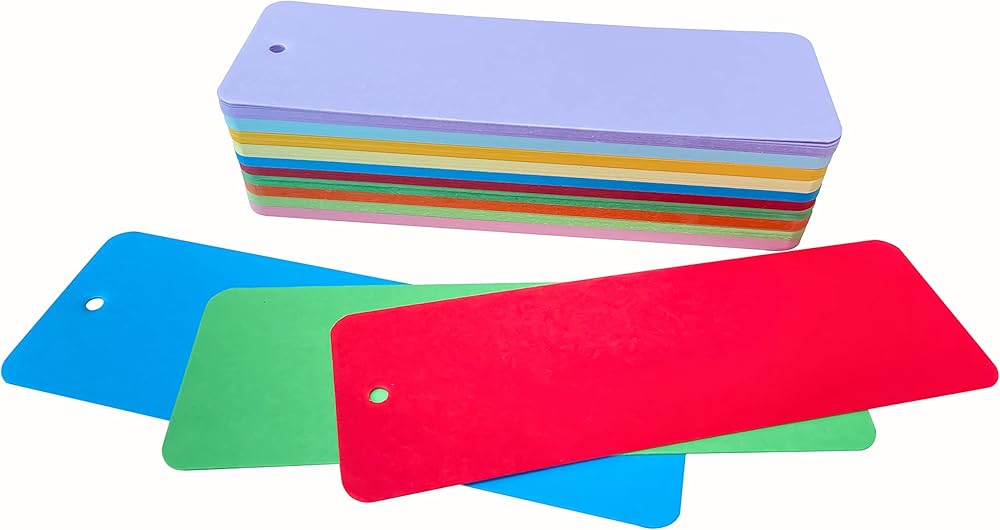The package includes 100 Pcs premium blank bookmarks (10 assorted colors per pack), and each bookmark measures appr. 5.9" in length and 2" in width, with rounded corners.