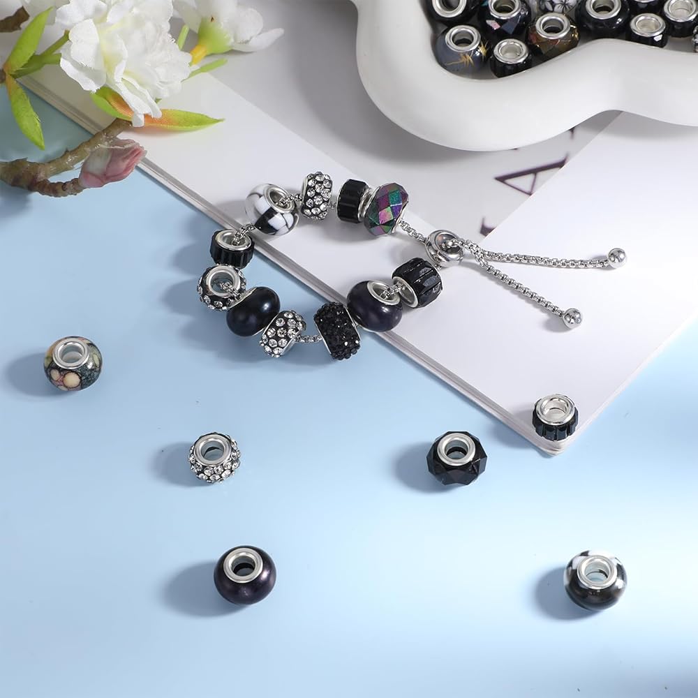 Exquisite Appearance: European beads are 15mm in diameter, about 11mm thick, and have a large hole size of 5mm. They are made of high-quality glass resin, some of which are inlaid with rhinestones, and the holes are equipped with high-quality brass cores. The black mixed color looks more advanced.