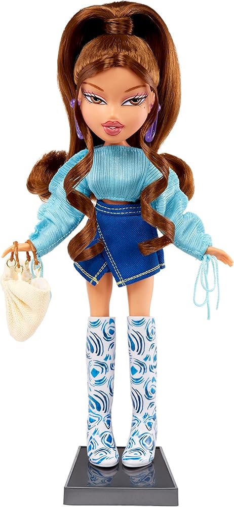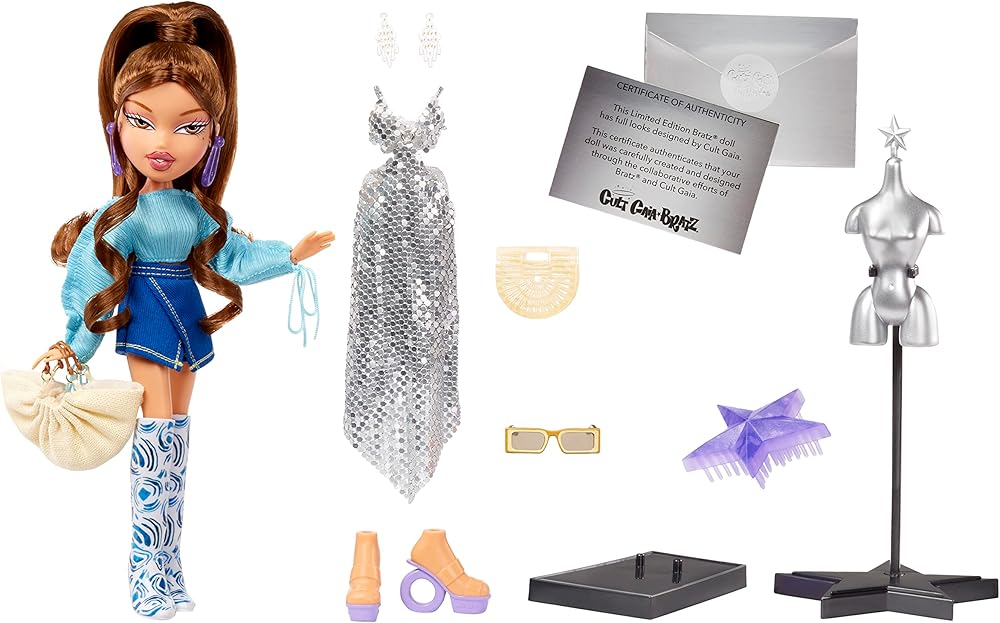 INCLUDES: 1 Bratz x Cult Gaia Special Edition Designer Yasmin Fashion Doll, teal blue 'Mala' top, royal blue 'Alma' short, 'Dari' silver metal mesh full length gown, 'Hera' sunglasses, crystal chandelier earrings, purple drop earrings, 'Irma' tote bag, 'Ark' bag, knee-high boots, 'Remi' platform shoes, hairbrush, dress form, doll stand, and certificate of authenticity. Collect both Cloe & Yasmin!