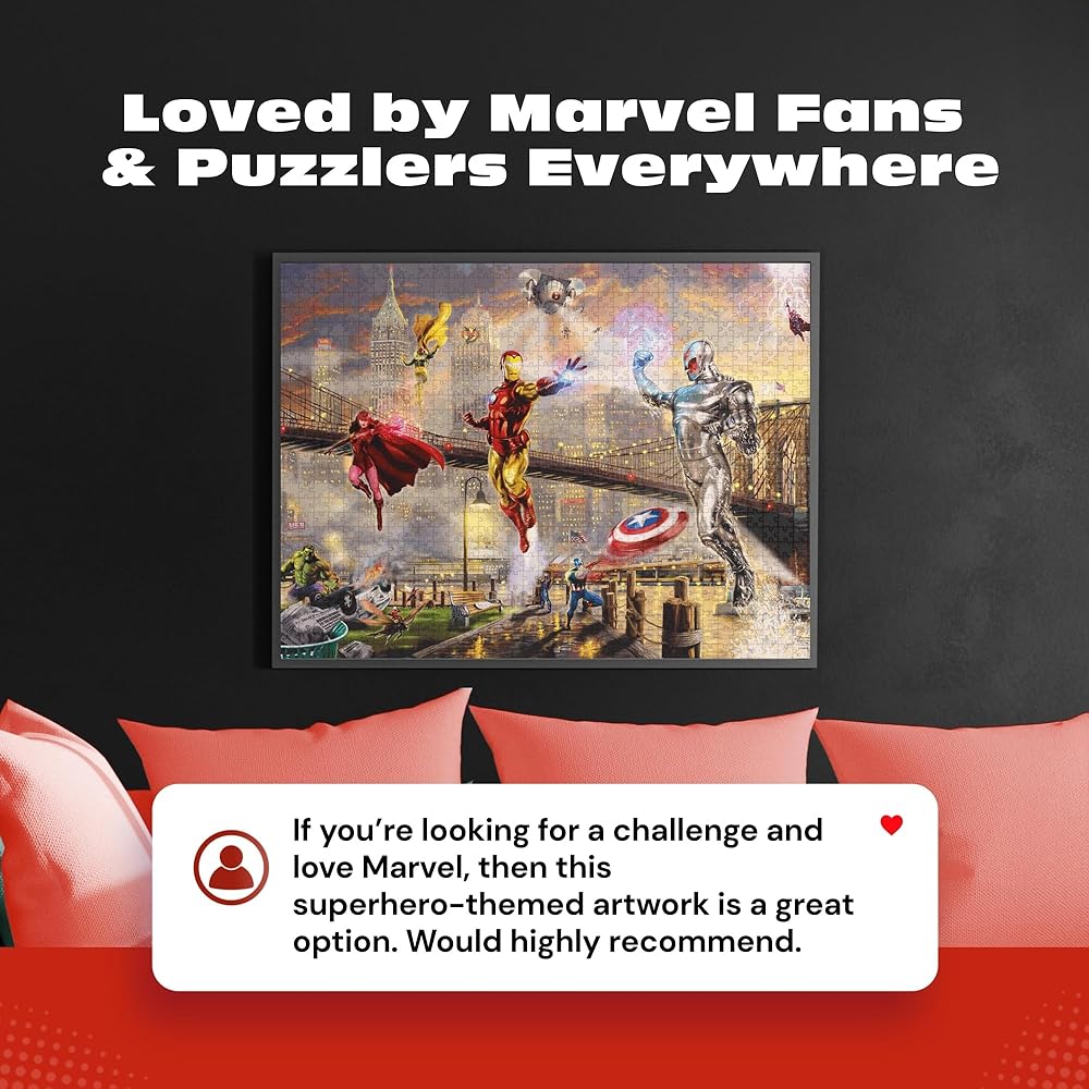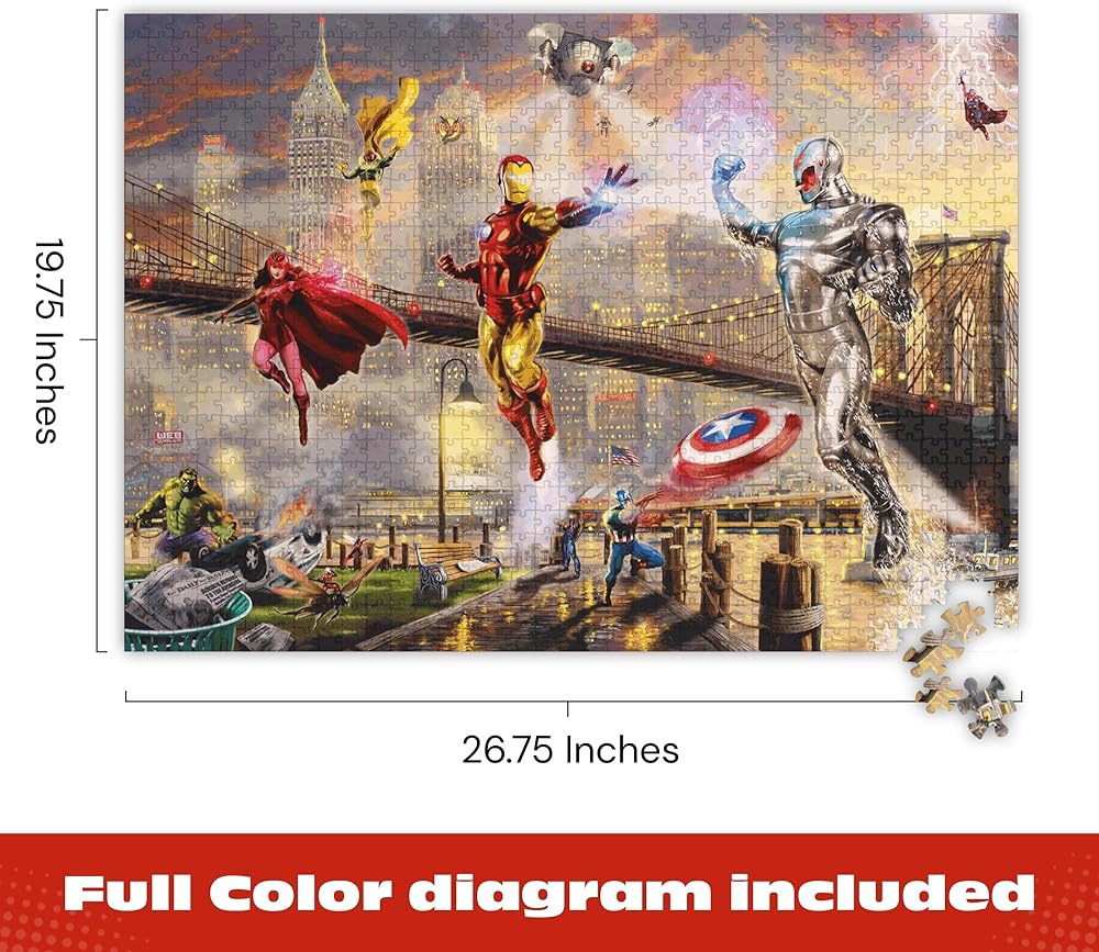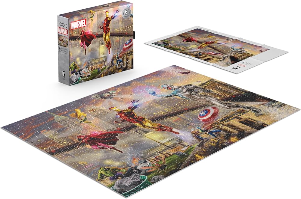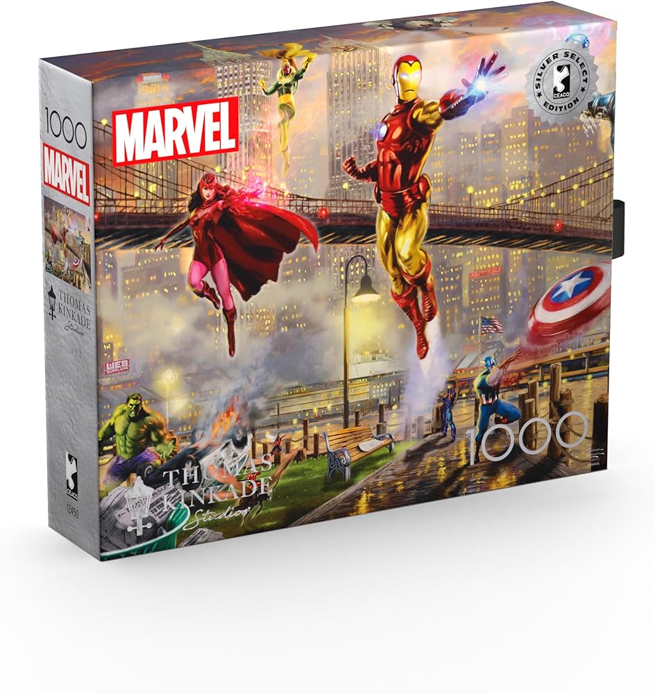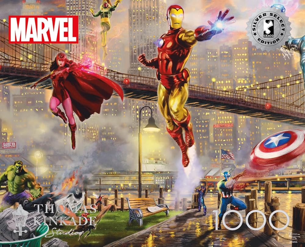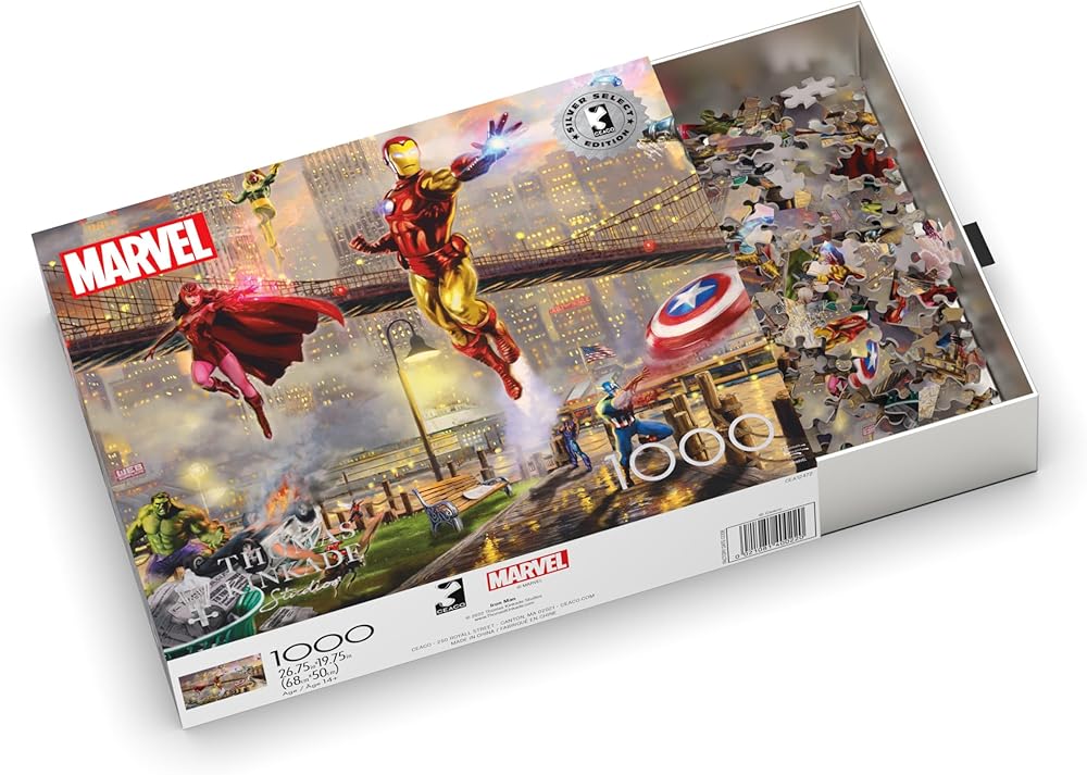 This 1000-piece 26.75 x 19.75 inch jigsaw puzzle, “Iron Man™” is part of our Silver Select collection, and features a Thomas Kinkade studios painting of Iron Man™ and the Avengers™ fighting Ultron™ over the New York City sky. The Silver Select puzzles are curated and timeless images from artists such as Thomas Kinkade and more. They are packaged in a giftable box with silver foil accents, use premium recycled puzzle board, and include a full-color diagram. This Ceaco Jigsaw puzzle is produced as part of a Buffalo Games collection. Count on Ceaco for the most Creative, Exciting, and Colorful puzzles since 1987. © 2024 MARVEL