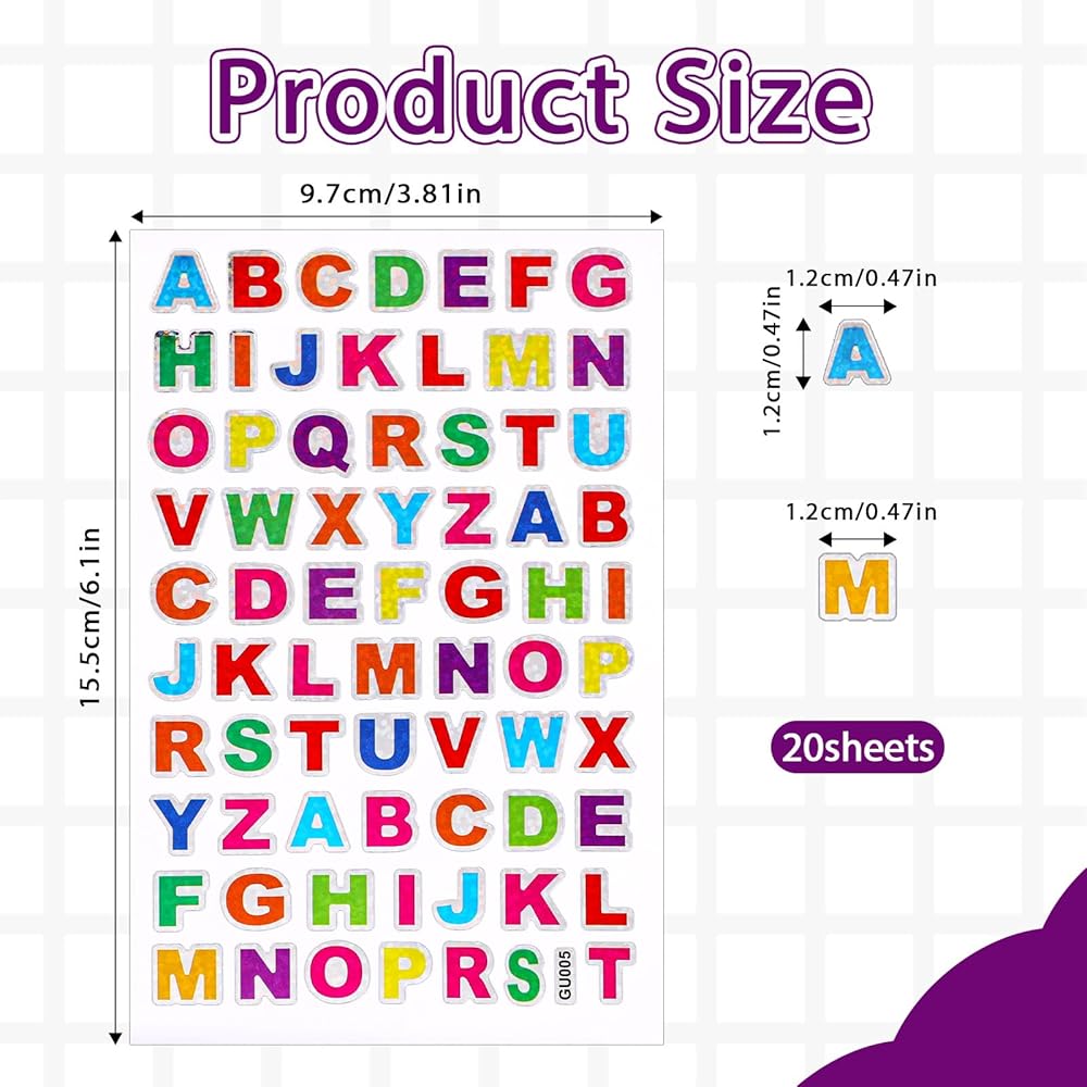 Product size: The size of a sheet of small letter stickers are about 6.1 x 3.74 inches/15.5 x 9.5 cm, and the height of a single letter is 0.47 inches/1.2 cm, which is easy to handle and use.