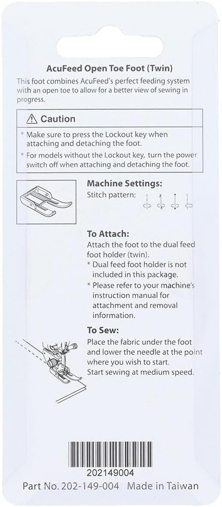 The Open Toe Foot is ideal for satin, applique, taper, and decorative stitches. The open front gives greater visibility for accuracy and more room to accommodate dense decorative stitches.
