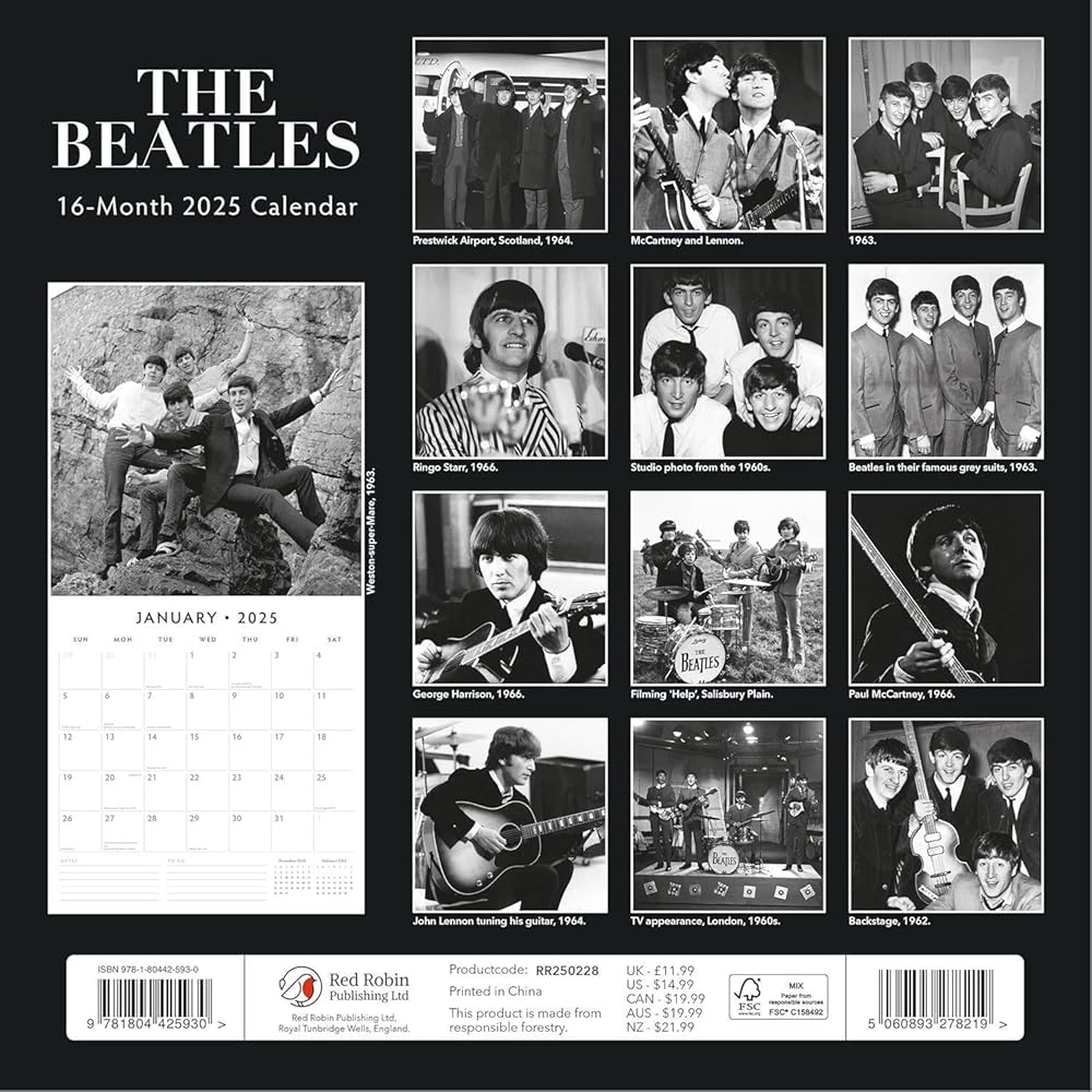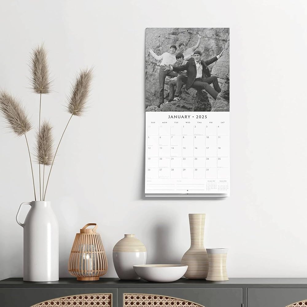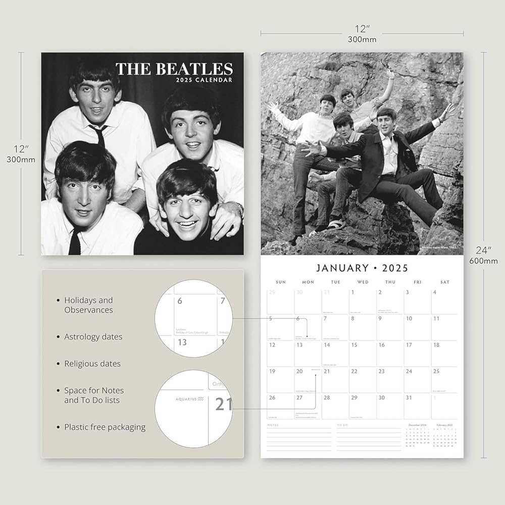 The 12-month hangable design is perfect for display in your home or office, bringing the spirit of rock and roll into your daily life. Completely plastic-free and made with eco-friendly materials, this calendar is a sustainable choice for music lovers. The premium paper ensures that the timeless images of The Beatles remain crisp and clear throughout the year, while the 4-month transition page for 2024 helps you stay organized as you plan for the new year.