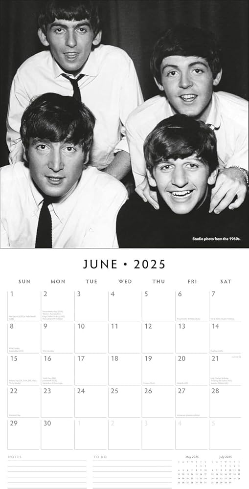 This calendar also includes holidays and observances, astrology dates, religious events, and space for notes and to-do lists, making it both a practical planner and a celebration of the world's most famous band in 2025.