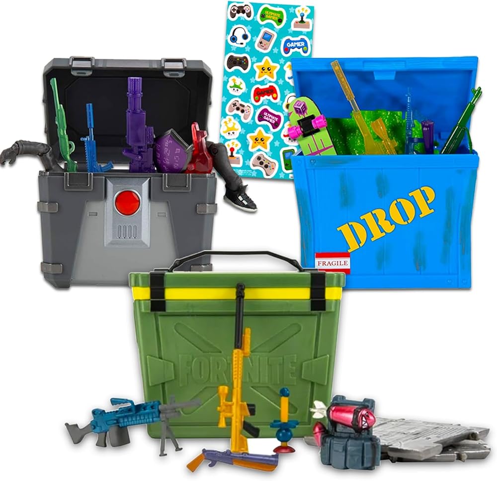 Fortnite Blind Bag Action Figure Set - 3 Pack Bundle with Supply Crate, Henchman Chest, and Battle Box Plus Stickers | Fortnite Mystery Toy Figurine Box. Set includes 1 Supply Crate, 1 Henchman Chest, and 1 Battle Box.