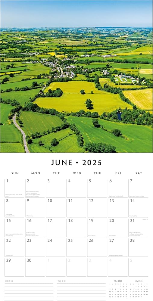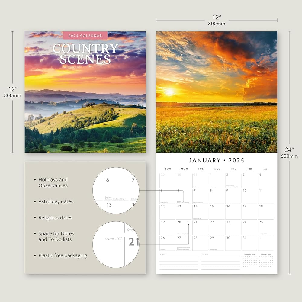 In addition to its beautiful imagery, this calendar includes all major holidays, astrology dates, religious observances, and space for notes and to-do lists. The 2025 'Country Scenes' calendar is both a visual delight and a practical tool, perfect for staying organized while enjoying the calm beauty of country life.