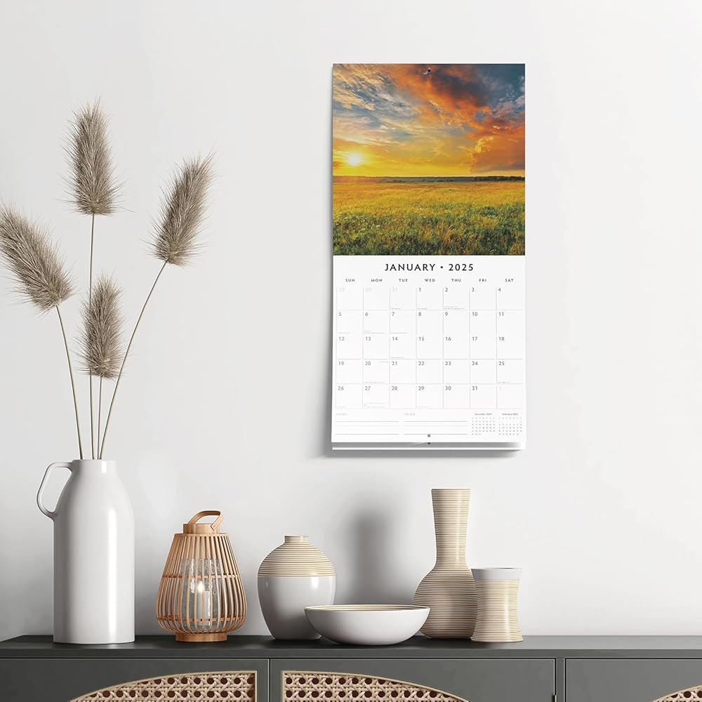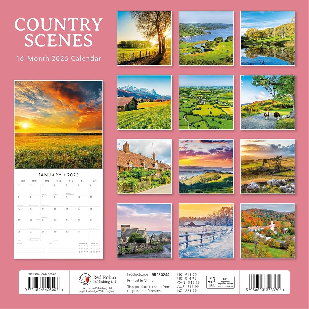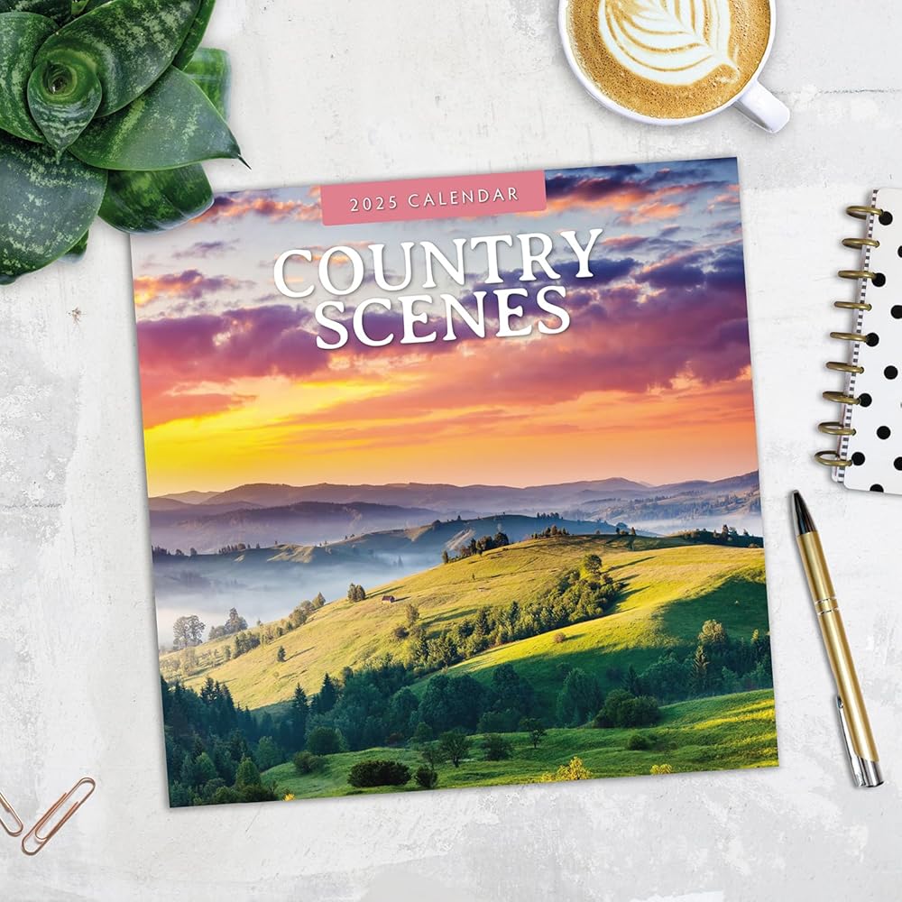 Escape to the peaceful charm of rural life with the 2025 'Country Scenes' wall calendar. Measuring 12" x 24" open, this calendar is printed on premium thick & sturdy paper, ensuring that the colors and details of idyllic countryside landscapes remain vibrant all year long. Each month features picturesque scenes of rolling hills, rustic barns, winding country roads, and tranquil farmlands, offering a serene visual retreat from the hustle and bustle of daily life. Whether you live in the countryside or simply long for the simplicity of rural living, this calendar brings the peace of the country into your home.