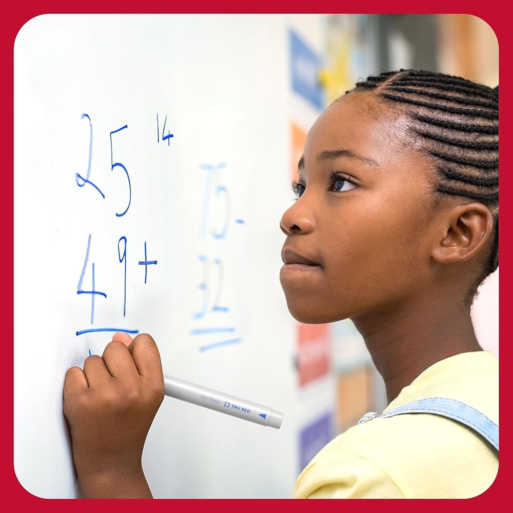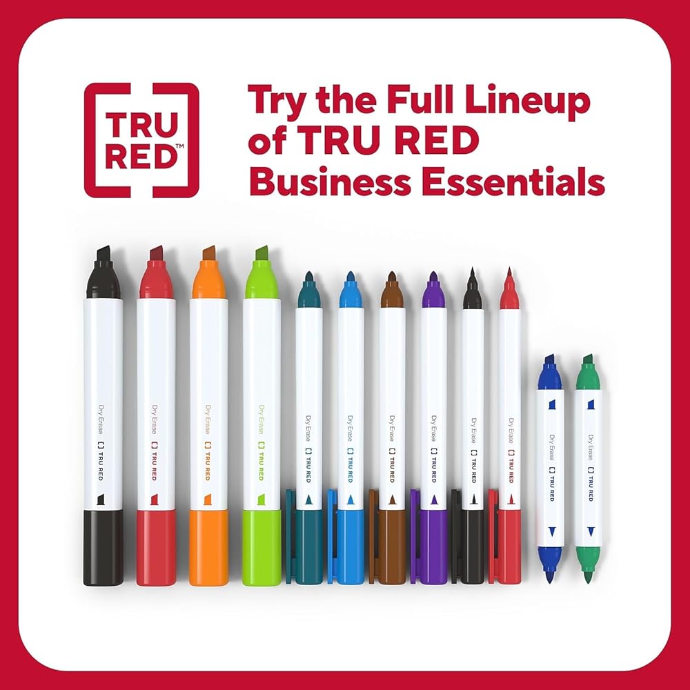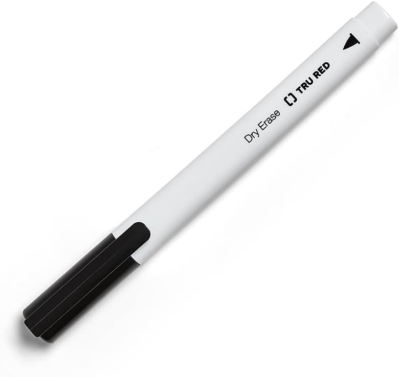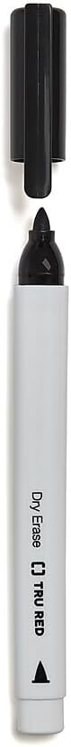 Write and erase on whiteboards, glass, and other dry erase surfaces. Bold black ink that erases cleanly. Fine tip markers for marking and labeling. Low odor formula ideal for classrooms, office, or home. White barrel designed with tip type graphic helps you quickly select the right dry erase marker to use. Barrel shape not only provides a comfortable grip, but also keeps the marker from rolling off your desk. Dozen per pack. AP certified non-toxic Make the most of your presentations with this 12-pack of TRU RED fine tip black dry erase markers. Display clear drawings and illustrations on whiteboards and other nonporous surfaces with these dry-erase markers. Suitable for offices and classrooms, the fine tip ensures precise and smooth writing experience, while the low odor ink erases cleanly. These TRU RED fine-tip black dry-erase markers have caps that match the ink color for easy identification and to keep them from drying out.