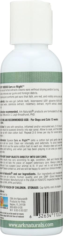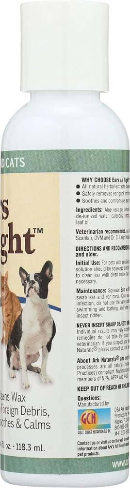 Ark Naturals Ears All Right has been formulated by our team of veterinarians, biochemists, and scientists to gently but thoroughly clean your pet's ears. Ears All Right inhibits growth of bacteria, viruses, and fungi, soothes and heals infected, inflamed and itching ears. We use effective natural herbal extracts that clean and heal ears without drying, burning or causing allergies.