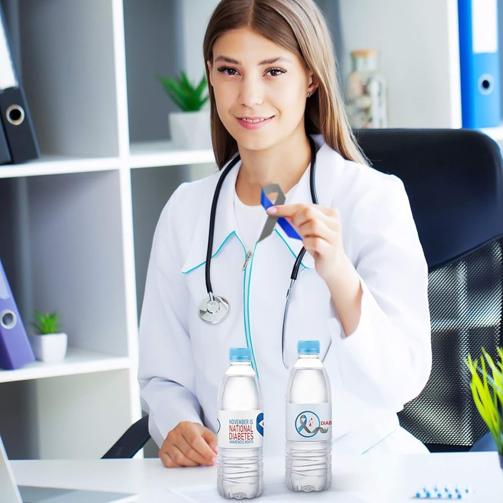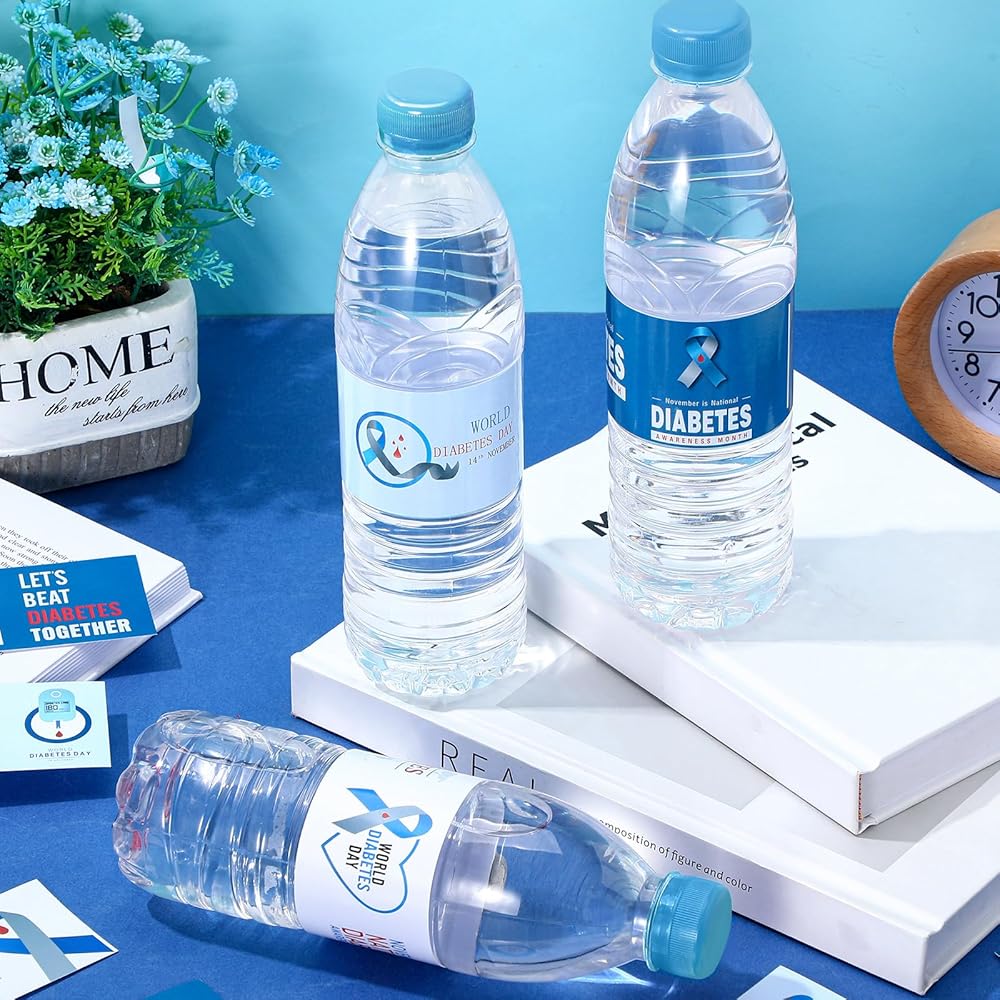 The diabetes awareness month water bottle labels are printed with ribbons, words [Diabetes Awareness Month], [November] and more, aim to raise awareness on prevention of diabetes, creative and meaningful.