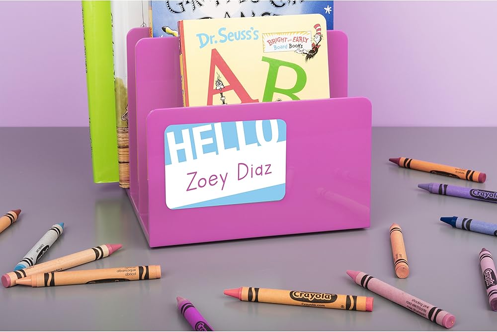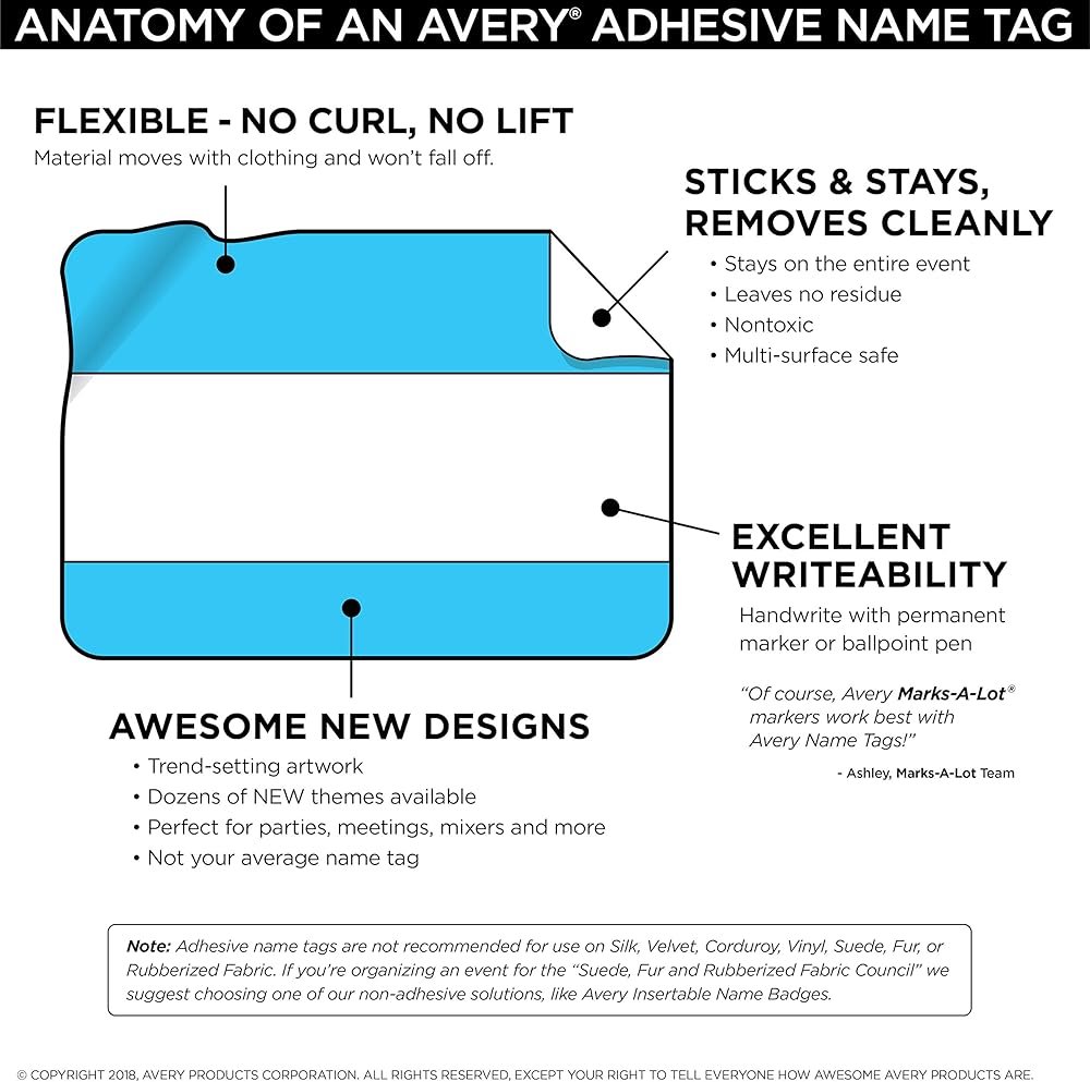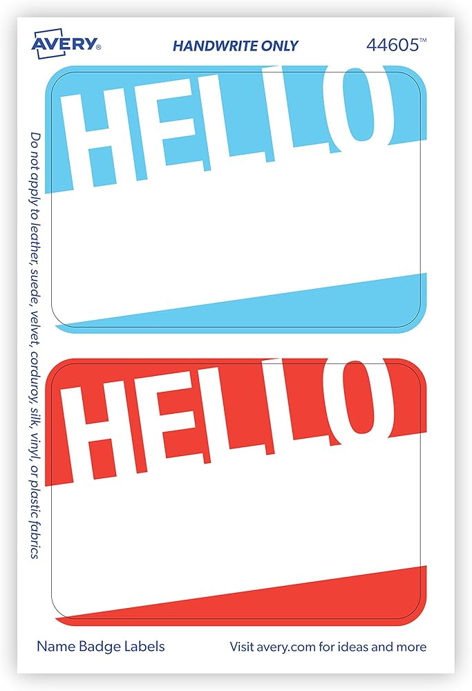 These bright Hello Name Tags feature fun ice-breaker questions to ignite lively conversations at any party or special event. These Avery name tags are perfect for networking events, housewarming parties, meetings, seminars and other occasions where introductions are necessary. The name tag is constructed from flexible material designed to move with clothing and stick securely without its edges curling or the tags falling off. These name tags stickers feature removable adhesive that is safe to apply to most fabrics but not recommended for use on delicate materials such as lace. Easily customize the name badge labels with a permanent marker or a ballpoint pen for smudge-free performance.