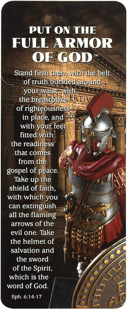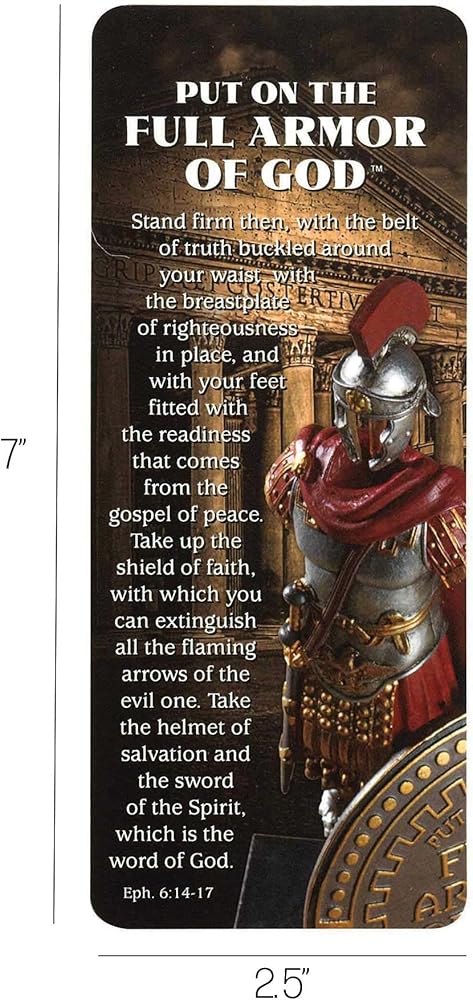 - يأتي كحزمة مطابقة من 12 ؛ تتميز بطاقة الكتاب بالارتياح من المشاعر من أفسس 6: 14-17 حول "وضع درع الله الكامل" مع مشهد جندي روماني لهجة